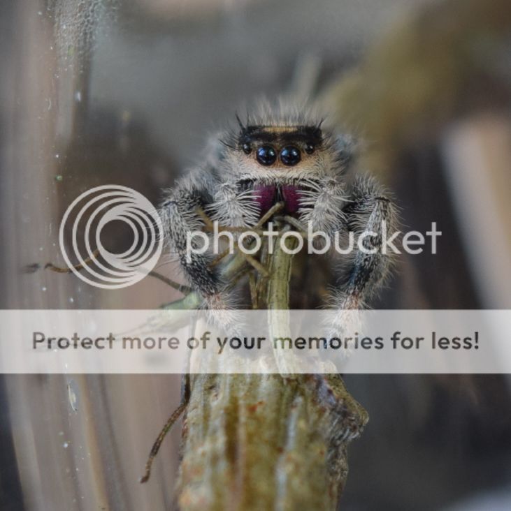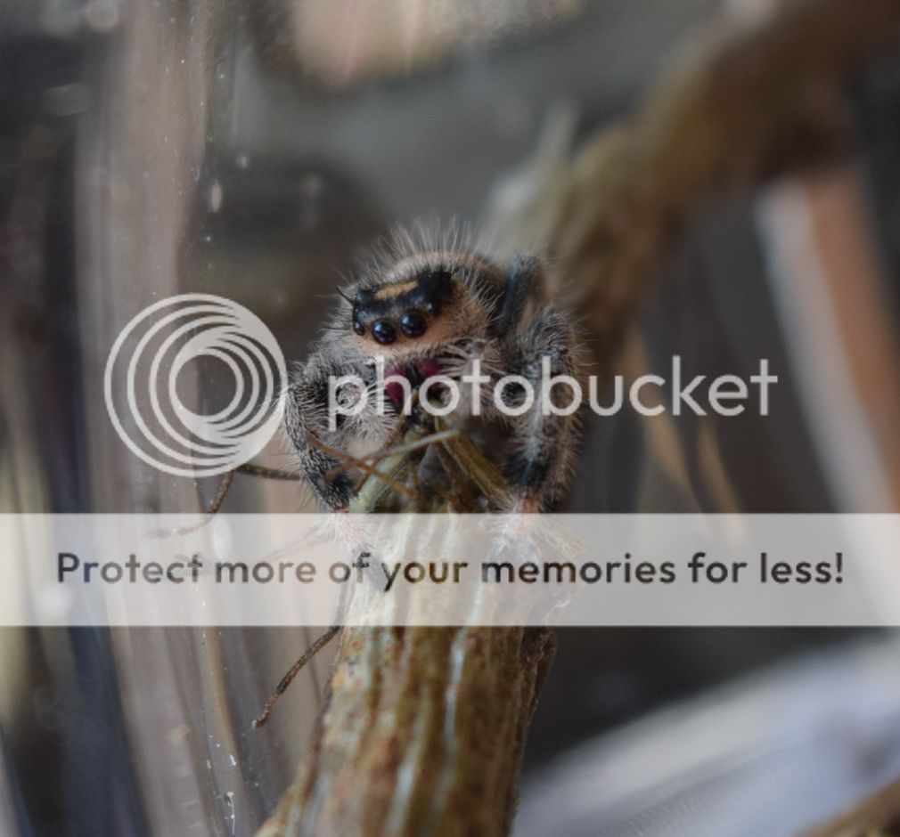 Just wanted to share these photos of Rosie the Phidippus Regius, She is about 10mm across I think, she's out and about quite a bit, yesterday she ate a stick insect- see photos- today a hatchling locust and a calciworm so quite an appetite- she is so sweet- these are the first photos I had where I can see her cute hairy little face- taken with an ipod. she's so gorgeous I feel I must get my paints out and try and paint her.