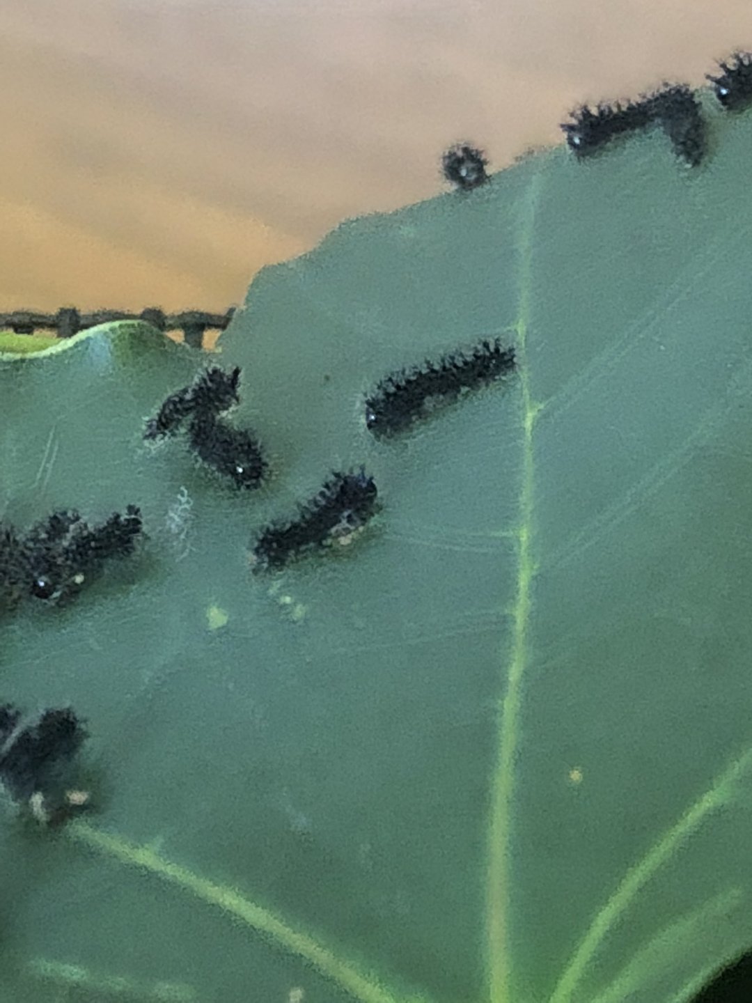 Anyway, all those tiny little eggs started hatching over the last few days. I put them in one of my silkworm containers and gave them some leaves to munch on.