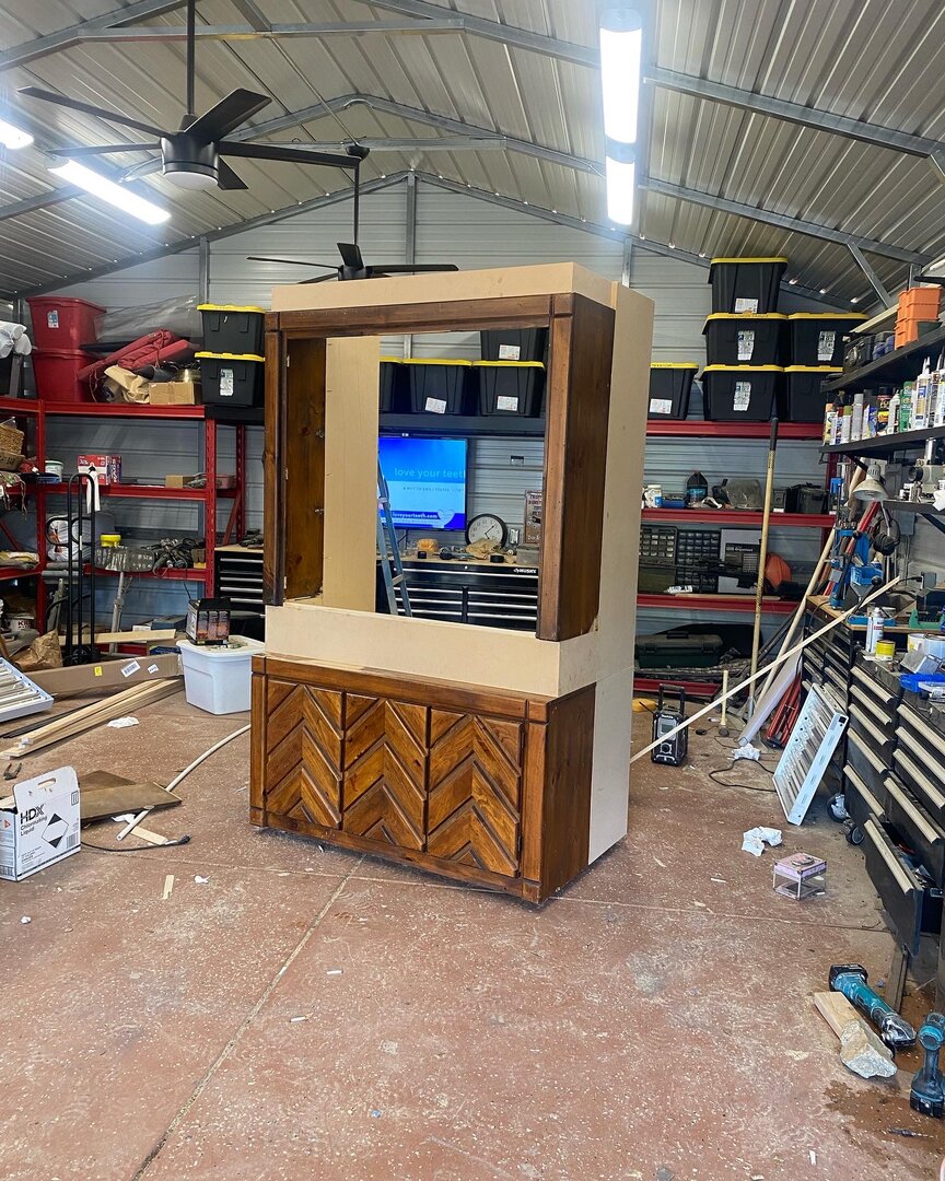 . Same conversion as my previous Took a China cabinet, added heights and depth to it . Lined the interior with 8 inch plexiglass . Put a 1 inch rim Around exterior bottom then pulled down the 8th inch plexiglass with drain .was Still having issues with having to fill water up daily or every other day . So I watched a How do YouTube video on Home made foggers . Converted a 47 gallon Home Depot tough made Storage bin. From house of Hydro . Now contains all water for fogger and misting system . Put exterior fill up on side of the cage Which makes climbing in and out of the cabinet Only to dump waste water . Special thanks goes to Craig Of primo chamaeleons for making a lifetime dream of Owning a parsons come true . Boaz is currently enjoying her new beautiful enclosure ..