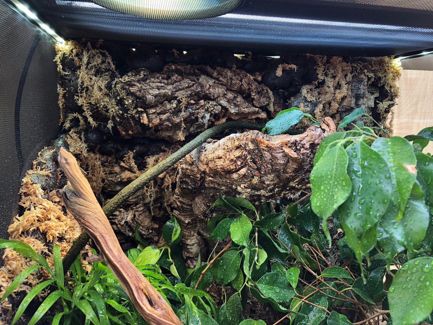 - Ten large pieces of cork bark for custom background texture and planters, including five cans of Great Stuff Pond & Stone expanding foam intermixed with soil and sphagnum moss (100% of back covered, 80% of left side covered to help control humidity in arid Arizona). Backed with wood paneling so foam/cork doesn't show through the screen.