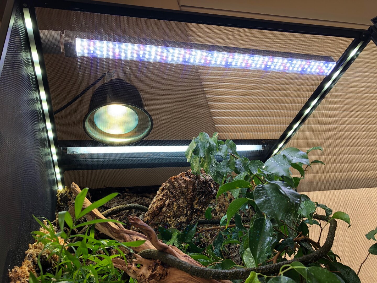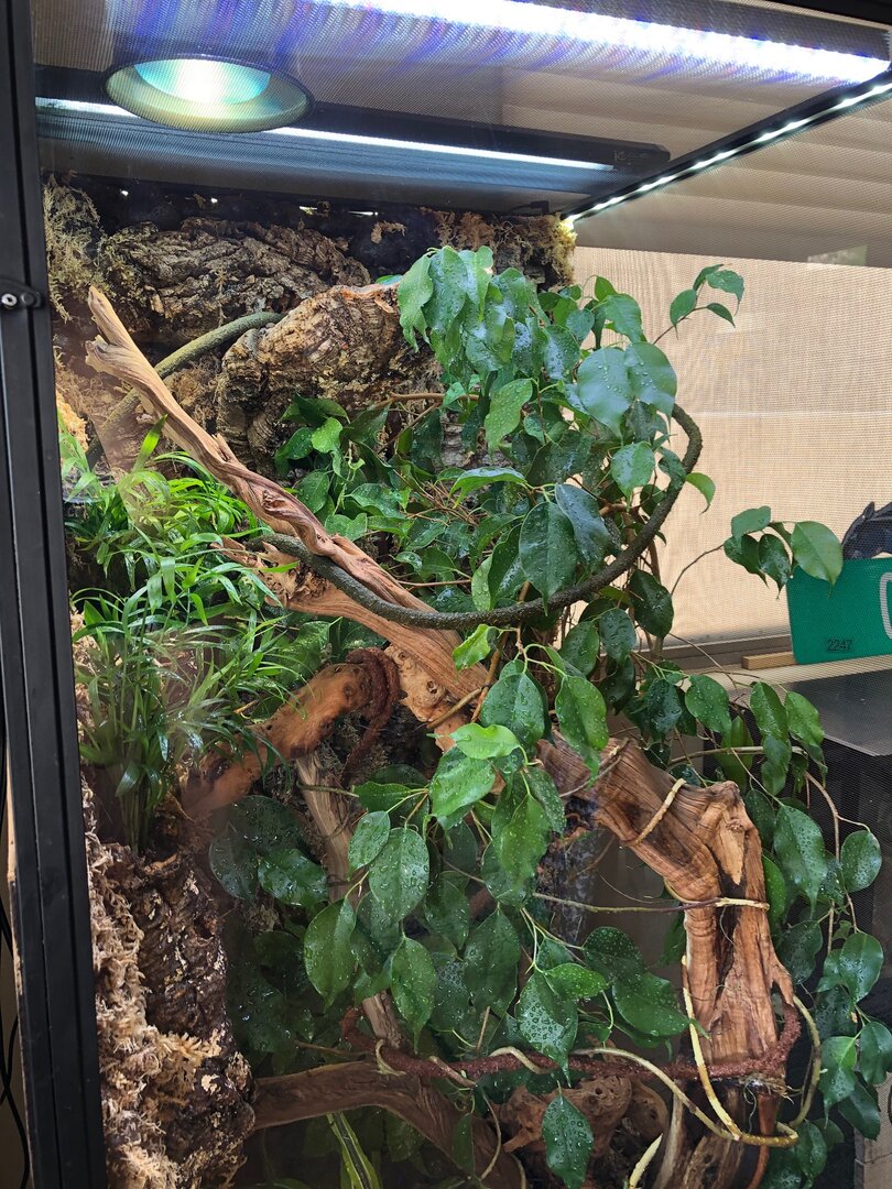 I'm unable to take the terrarium with me (soil regulations alone, not to mention its shape or weight), and no close friends here are very interested in herping. In the past few months, all of the live plants are thriving (a bit too much; the ficus benjamina is taking over!), receiving plenty of light from the plant bulbs and are misted/watered by hand once every ~2-3 days.