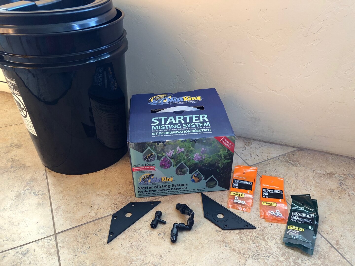 - MistKing Starter Misting System (new in box; never opened or assembled), plus 5 gallon opaque reservoir with lid, 2 corner screen mounts, extra nozzle, and all hardware for installation