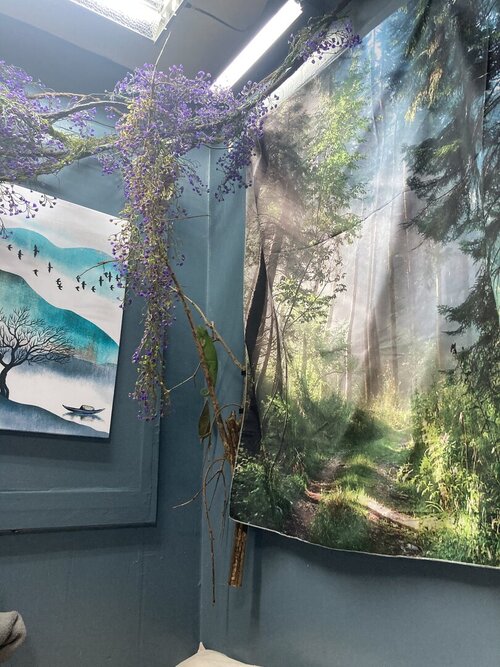 She now has double view, and both sides are windows and she can watch from atop of her branches to the garden or to the more actively street side.