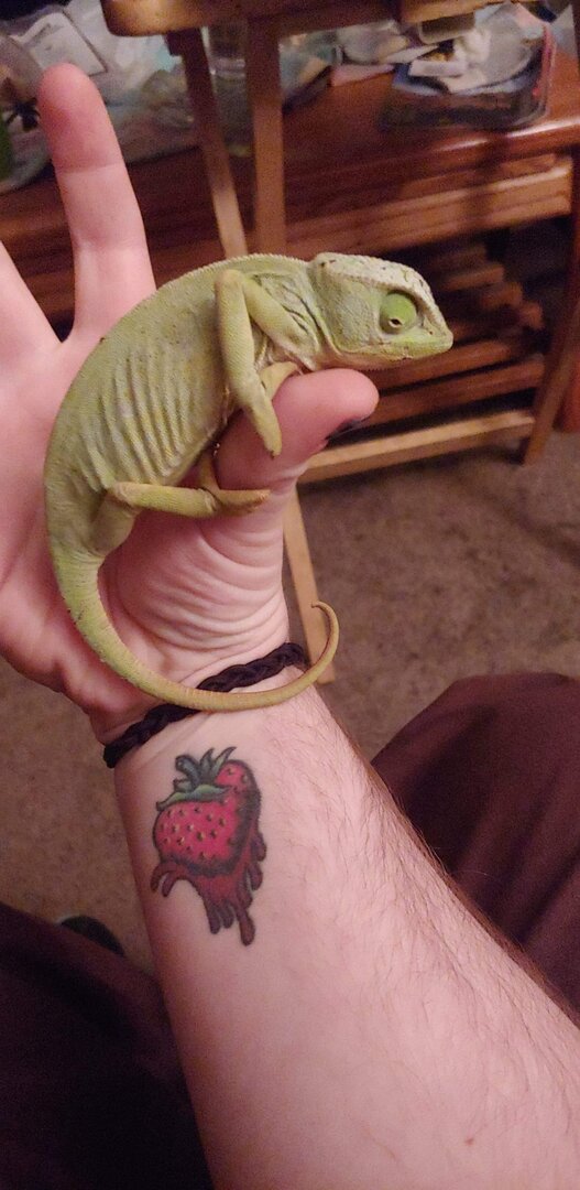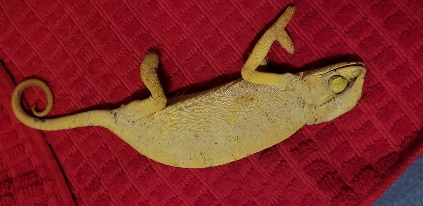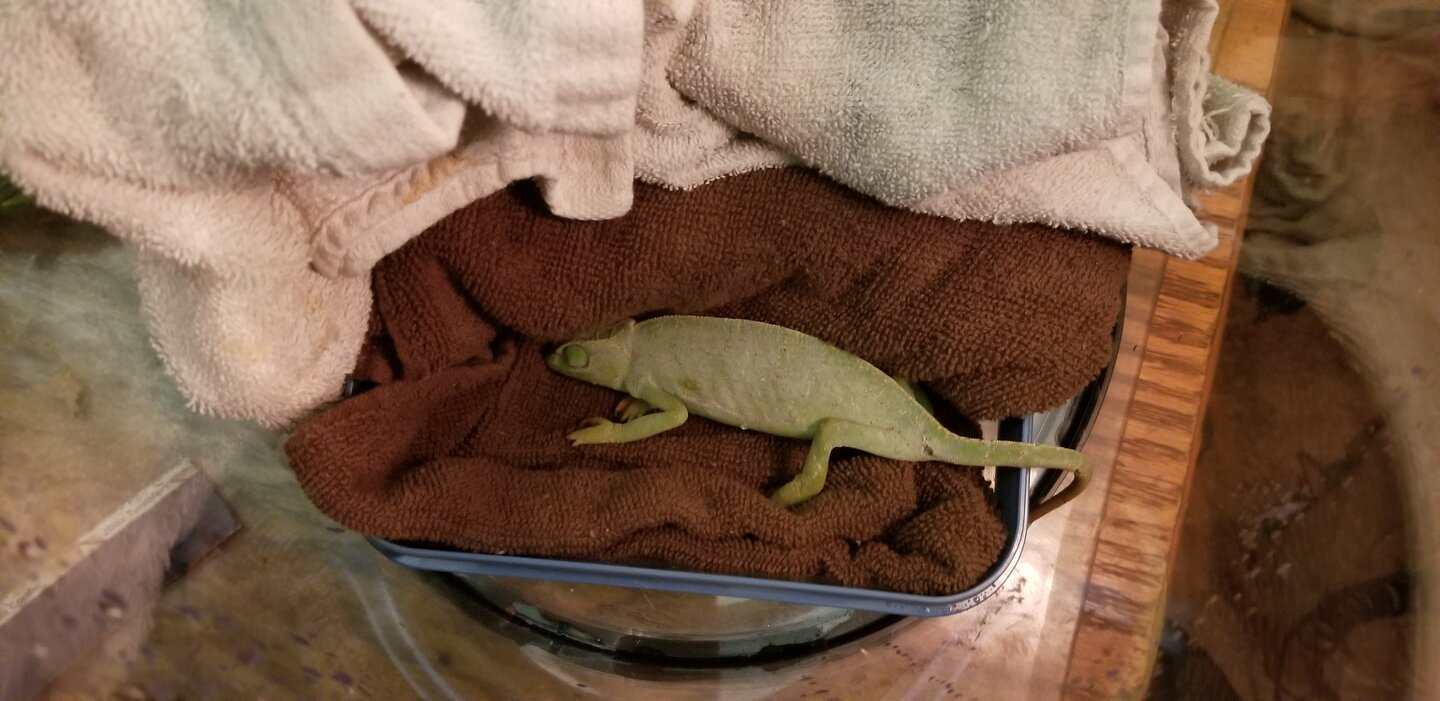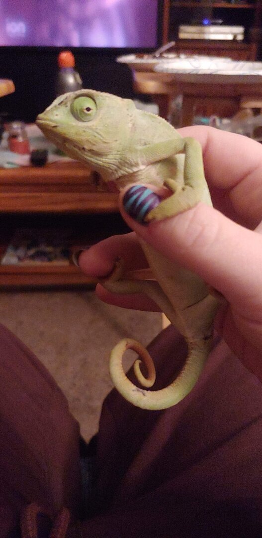 I have a Senegal chameleon that I have had for exactly a week. We have him in a 40 gal tall that has mesh on the top of it and on the side to get him out. The rest is glass. At the breader we got him from the told my husband and I that because we live in az we needed to do the glass tank and not the mesh so that's what we did. He has many vines to climb and tree branches. We keep the humidity at about 60%-70% in the cage and the temp where he is is about 80 dagrees. When we first got him he was great, nice and green wanted to come out and crawl around on us but 3 days ago he started going down hill. We came home and he was laying flat on the bottom of the tank in the dirt and he was such a pale yellow he was almost white. We thought he was dead. My husband went in later to try to take him out to dispose of him and that's when he picked him up that's when we noticed he was still breathing. we thought he might have been cold so we put him on a very low temperature setting to try to warm him up but it wasnt helping. We got in contact with a friend and she said he might have been over heating and to let him just self regulate. The second day we took him back to the breader and they told us he looked like he could have had a upper respiratory infection (small one) and he looked dehydrated. at this point he is a bit greener that the prior day. So all the second day we watched him 24/7 made sure he was good and drinking lots of water also needed to dry him out. On day 3 he seems greener. Not to his full potential but he is very week. Doesnt seem to want to eat. Hasnt ate for 5 days now and he is very weak. Wont really gab on to anything and hold on unless he doeant want be where we are putting him but for the most part he just lays and sleeps. How do I help this tiny creature?