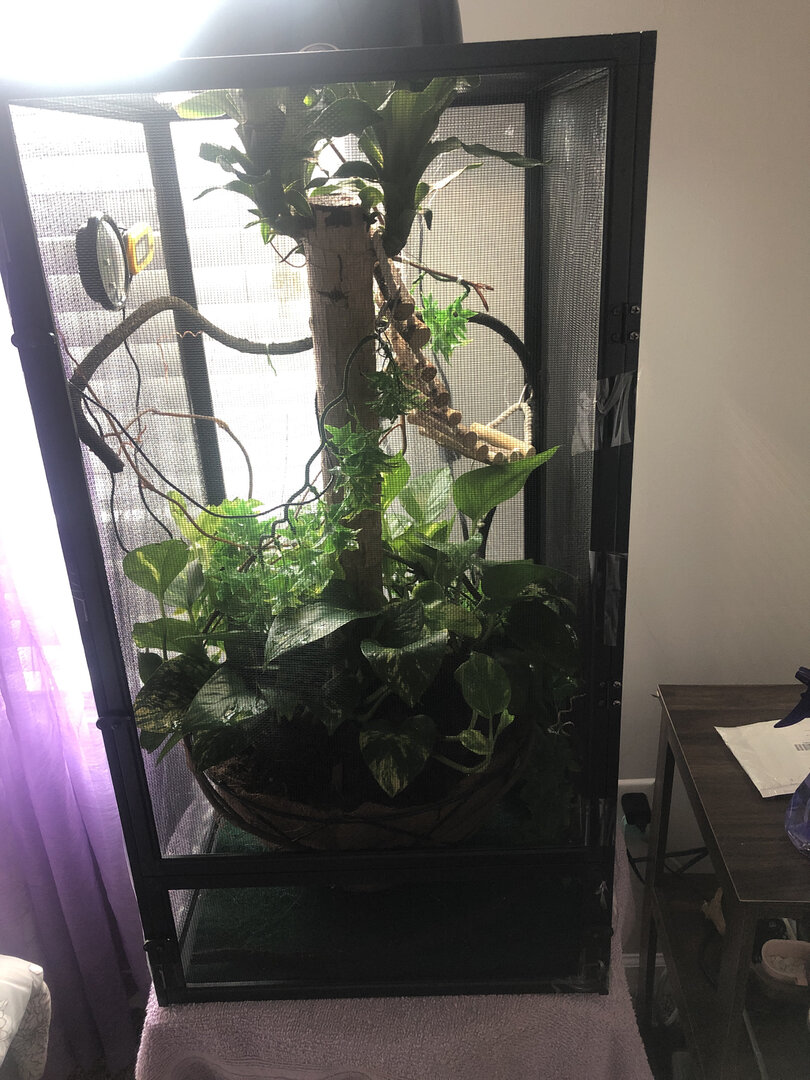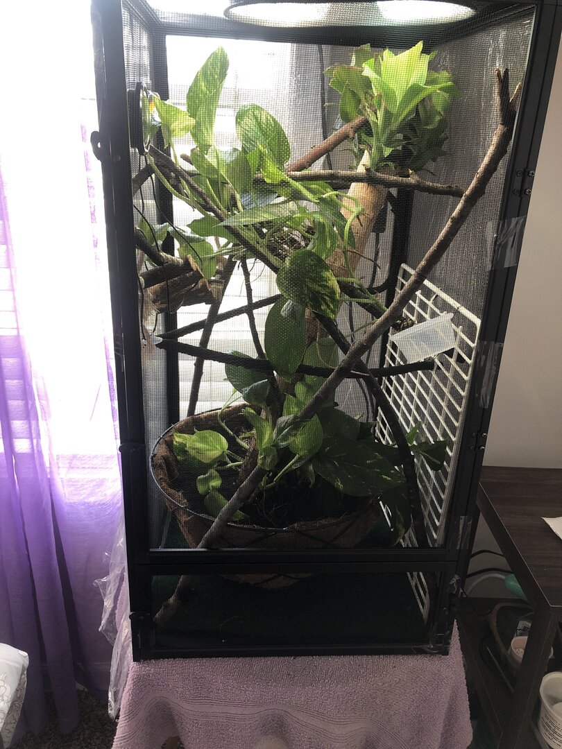 i have it covered with plastic to help maintain humidity. i would like some set up tips with the plants i bought and how i should go about adding more horizontal branches for him to perch on. also the pothos i have aren’t as viney so i can’t really string them throughout. they’re all kind of at the bottom. after his vet visit i’m going to clean his cage and would like to do some rearranging so any tips on how i can rearrange his cage would be appreciated.