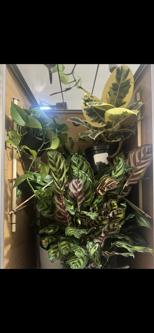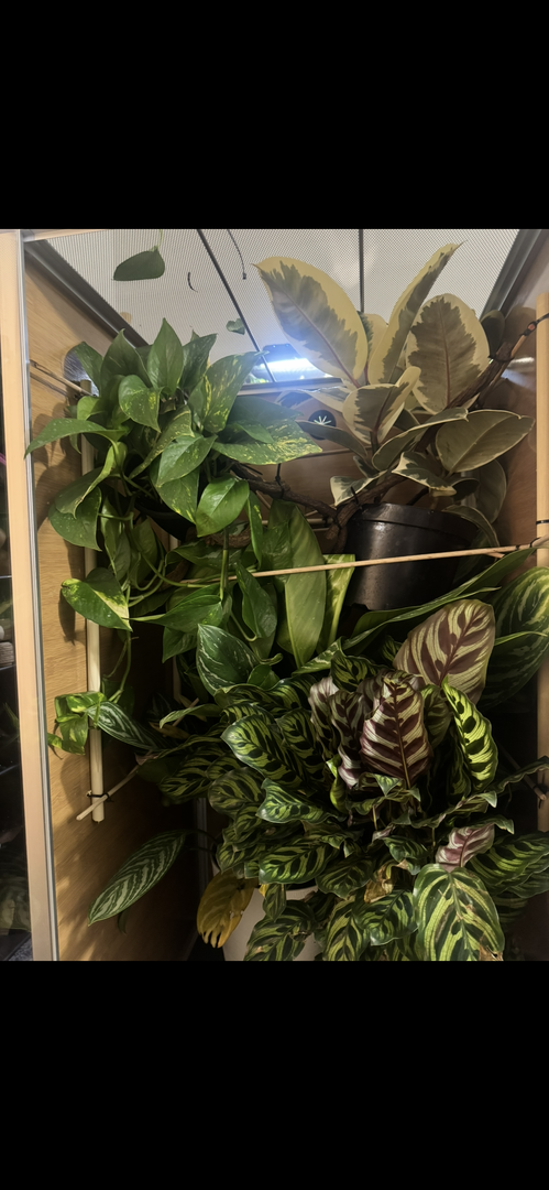 • Plants - Are you using live plants? If so, what kind? Yes pothos ficus umbrella and prayer plants. Washed rinsed and rebooted before put in enclosure