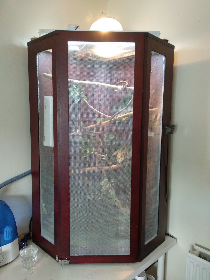 • Watering - Automatic dripper on top of cage - topped up 3x daily (from mistking pump which he HATED) so drips go for about 4h/day total. Also humidifier keeps the humidity at 100% overnight. He has a drinking glass which I change out daily which he also drinks from regularly.