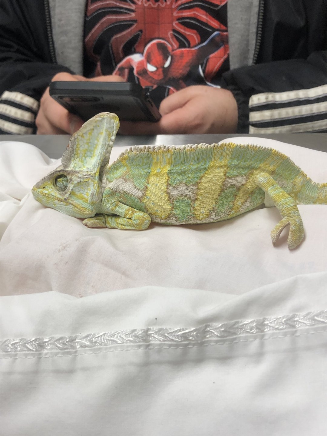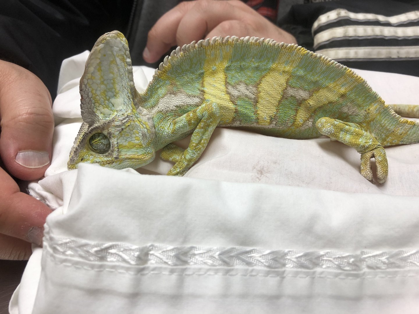 I got a veiled chameleon yesterday from a lady who said that she didn’t have time to take care of a chameleon and that in a week he lost a bunch of weight and became dehydrated. He is at my vet right now fighting for his life. He is doing much better today than he was last night but he is still very weak.