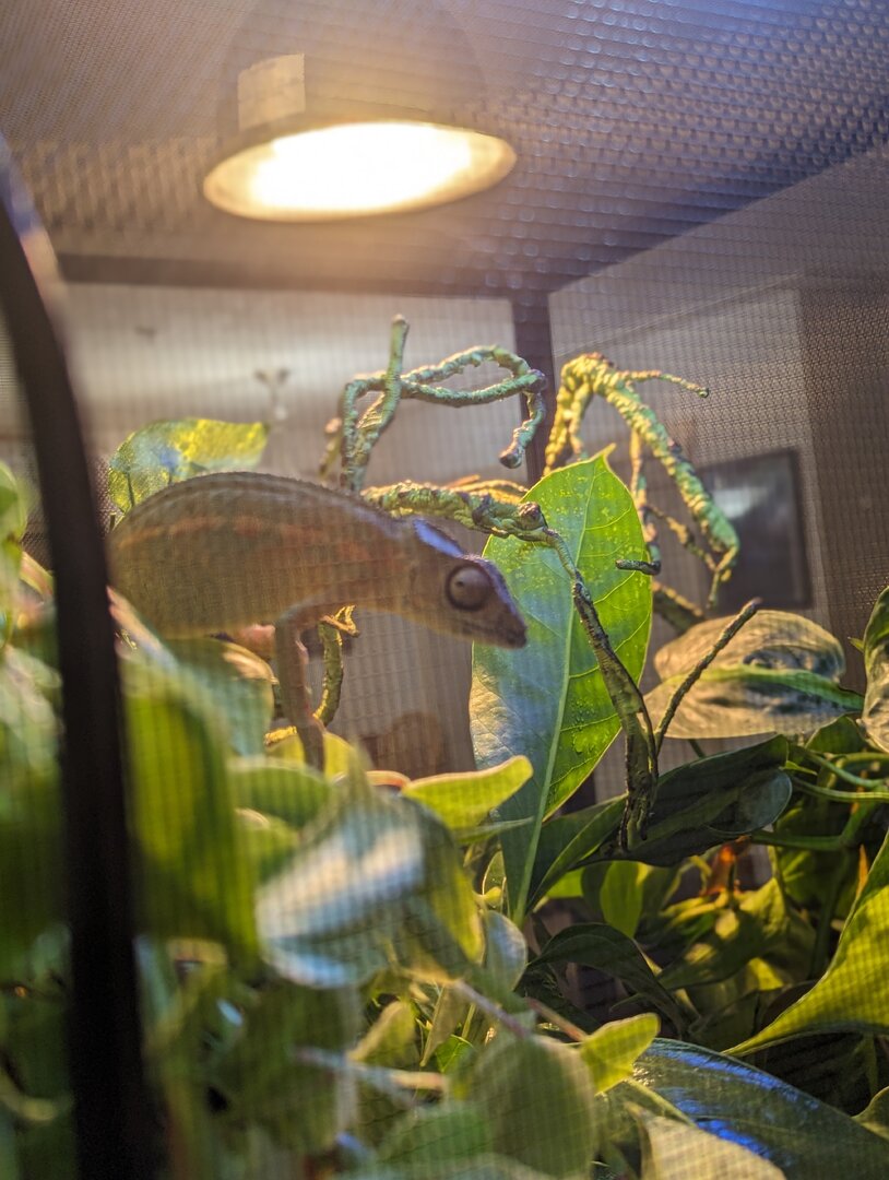 She's eating, she's eating, she's eating! Leaves... But still. It's been 2 weeks today since Kailie lost her tongue. For the past few days I have been able to get her to take one wax worm or meal worm along with her syringe feeding. I still have to use the syringe to open her mouth, but she will eat the one. Today, I managed to get her to swallow 1 meal worm and 2 wax worms before she clamped down and refused to open her mouth even with the syringe. But tonight I was watching her in her cage, and at first I thought she was trying to drink from the leaves... Until she tore a pothos leaf right off and started chomping away. I was a bit worried at first, as I didn't know they could eat leaves, but upon some research, pothos and ficus are safe, and apparently they'll eat them for roughage to help digestion. So it's