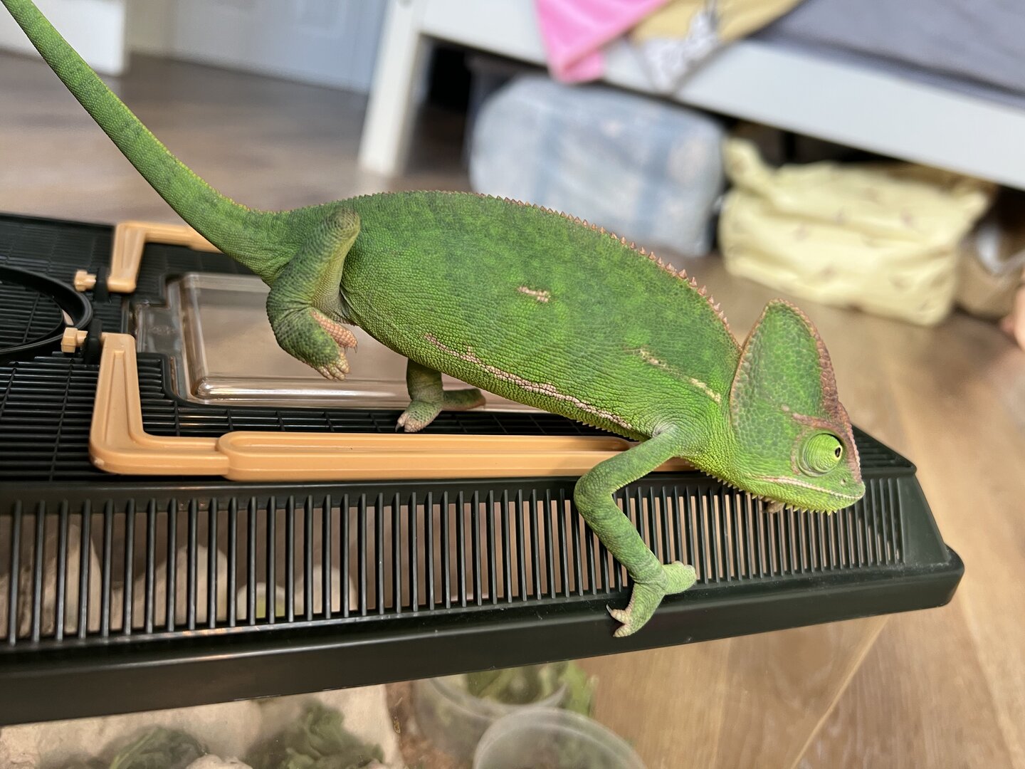 So decided to hand feed Pascal tonight for a change since she was willing to climb on me, noticed she wasnt doing to well navigating where the food was even when it was right in front of her … I held her and put her food on the floor about 10cm away from her and she just couldn’t get to it, her tounge would only shoot out a couple centimetres, even when it was directly in front of her her tongue wasn’t shooting out far enough to reach her food … seemed off since she’s usually so quick to eat and can normal target her food from a distance away if that makes sense.