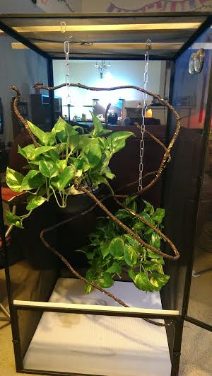 Sidenote: The brown jungle vines will be wrapped with fake foliage to give him some more hiding space and stuff. I will also use the plant vines themselves once they grown some more and will eventually be all live plant and no fake ivy. I also have another plant to repot that will be in the bottom. It's a dracena(sp?). I am also eventually going to replace his small like 18 inch UVB with a huge 40 something that will be mounted on the wall behind his cage and two sides will be wrapped in a wood graphic paper kind of thing to give him more privacy.