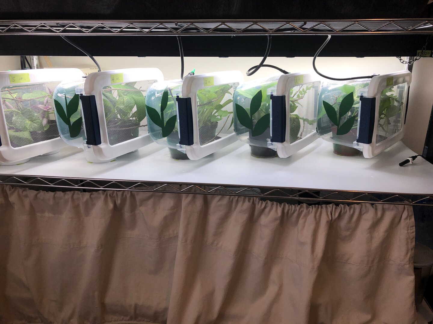 Here is what I came up with as the cages I wanted are not available, something about a pandemic. These are too small for most species but it will hold my guys in pairs for the first month and individually until maybe 4 months when they get moved into screen cages. They are screened on the front and top. The back is covered so they can't really see each other. Each one has two four inch pots that also serve as the feet to save space in the interior. My shelving is 18x48 and I have a 48" dual fixture with T5 UVB and 6500K for the plants it's providing plenty of heat for my Jackson's in fact I'm using a small fan to move off the excess. I put a valve in the line of my misting system to reduce the pressure and am using it to provide drip irrigation. I hand mist twice daily but the dripper works as a backup.