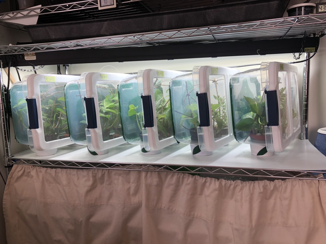 Here is what I came up with as the cages I wanted are not available, something about a pandemic. These are too small for most species but it will hold my guys in pairs for the first month and individually until maybe 4 months when they get moved into screen cages. They are screened on the front and top. The back is covered so they can't really see each other. Each one has two four inch pots that also serve as the feet to save space in the interior. My shelving is 18x48 and I have a 48" dual fixture with T5 UVB and 6500K for the plants it's providing plenty of heat for my Jackson's in fact I'm using a small fan to move off the excess. I put a valve in the line of my misting system to reduce the pressure and am using it to provide drip irrigation. I hand mist twice daily but the dripper works as a backup.