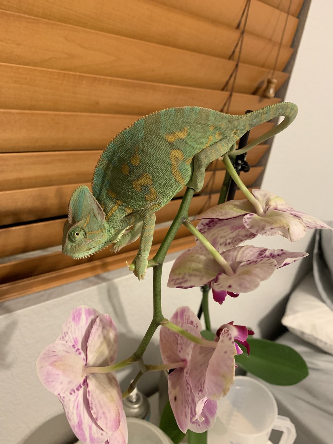 Lol i can relate so much to mine being a grump. After all i named oscar the grouch lol!.Heres Kyle. 2 year old grump. First pic on his favorite basking spot and the second pic is when I unexpectedly caught him in his travels down through the cage. He wasted no time in hanging upside down to puff up at me...