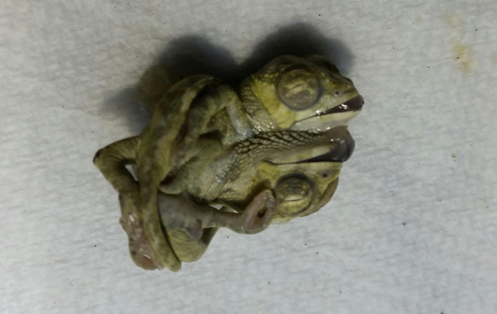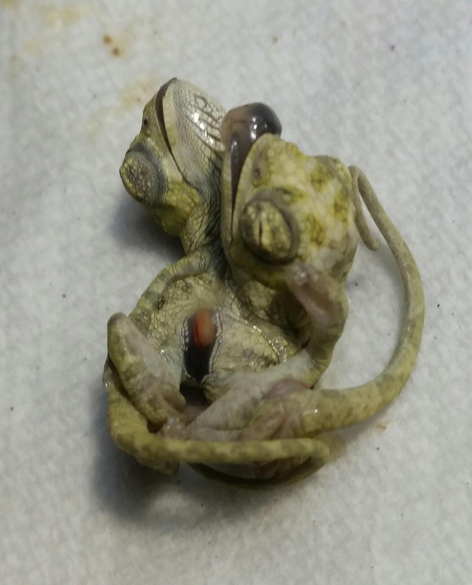 The egg went full term, a little larger than the others. It shrunk and acted like it would hatch, but never did. I opened the egg today and found Siamese twins. They have all their legs and tails, but are conjoined in the chest. Not sure if that is the heart and liver showing? Maybe a vet will chime in. They got quite large and fully formed. Poor babies. 14 perfect babies have hatched from this clutch.