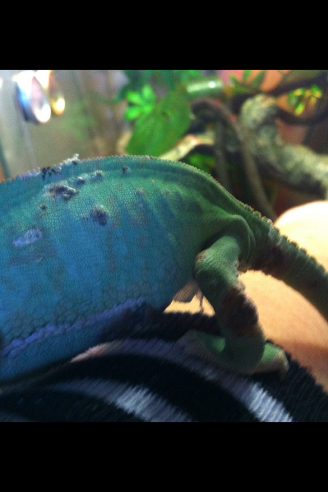 I was talking to a guy today that I had called to get a 9 month old veiled I'm still waiting for pics from him but one concern I had was he had said the little guy has a crusty spot on his skin that is not shedding skin as far as he knows , any ideas as to what it may be , as soon as I get pics I'll try and post