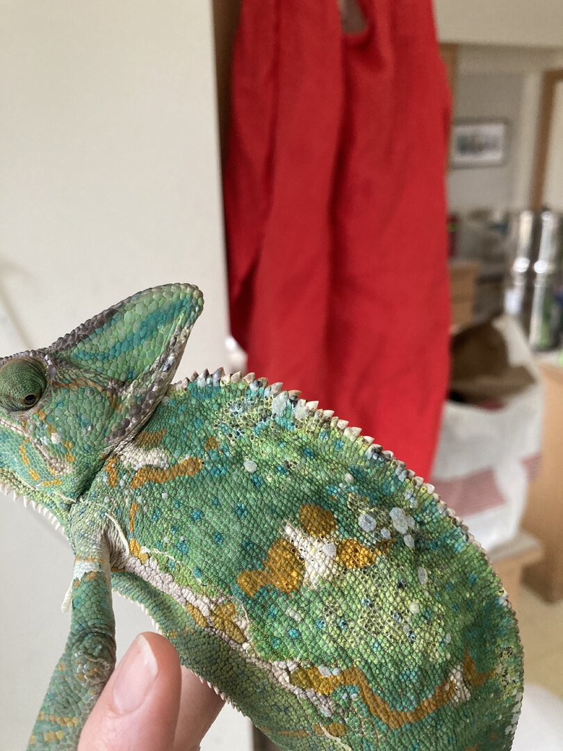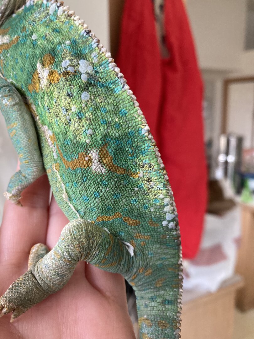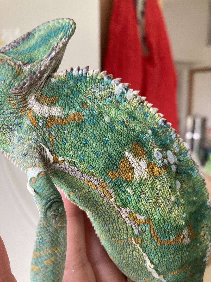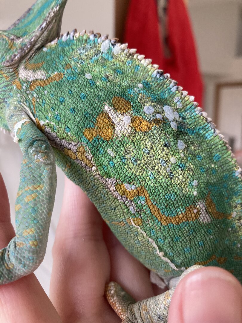 Today I noticed that my veiled, Rosie, has these light discolorations with black spots on her one side. There are also little blister-like areas of her shed - she just started shedding recently - but they’re dry. The discoloration and spots are not raised.
