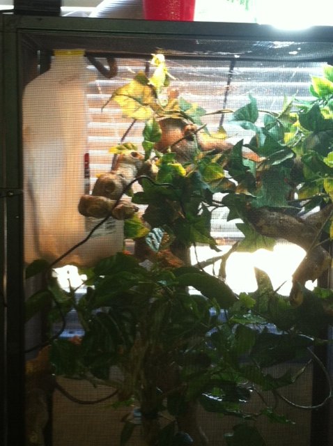 I just re-arranged Raines enclosure to get more foliage at the top. I figured out how to raise the bottom a little so that the branch goes all the way to the top. I also re-did the fake vines and raised the hibiscus off of the bottom. I think it looks better.. What do you think? I am gonna changed to a bigger dripper later today.