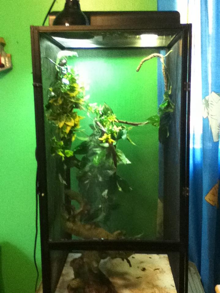 Are there any live plants in the cage? And do you have a basking lamp??