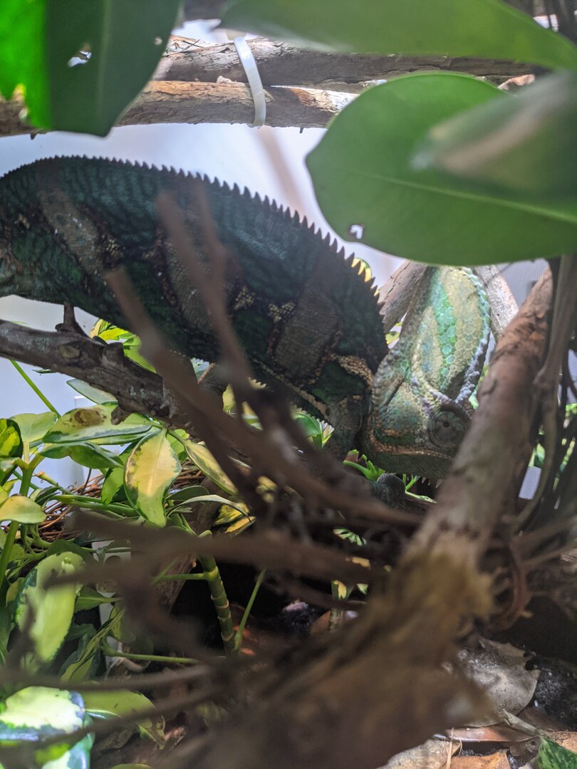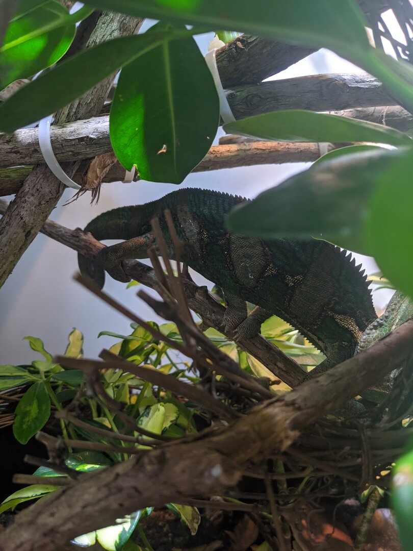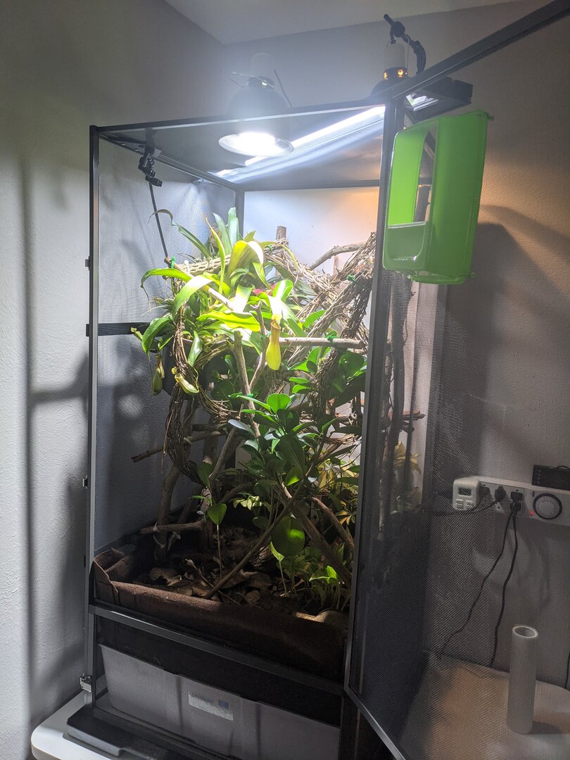 Temperature - it's about 60-65 at night so I can fog. Then 70-75 throughout the day. Basking spot is 80 at the branch. I have a flukers thermometer outside the cage to measure the room temps, a probe inside on the basking branch, and a temp gun. My govee bluetooth tracker kicked the bucket sadly! I put it in a bad position in the cage and it got misted.