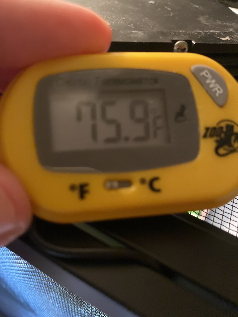 • Temperature - What temp range have you created (cage floor to basking spot)? Lowest overnight temp? How do you measure these temps? Basking 75-80 and 66 at night