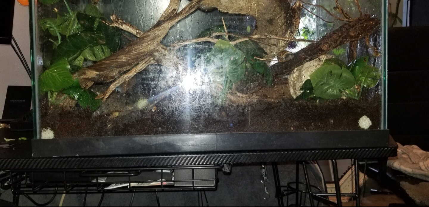 So for a 10g, what I used was one of those mesh reptile lids, and then I used clear packing tape and taped over the entire lid, except 2 2 inch squares. They don't need a whole lot of air, they need a whole lot of humidity.