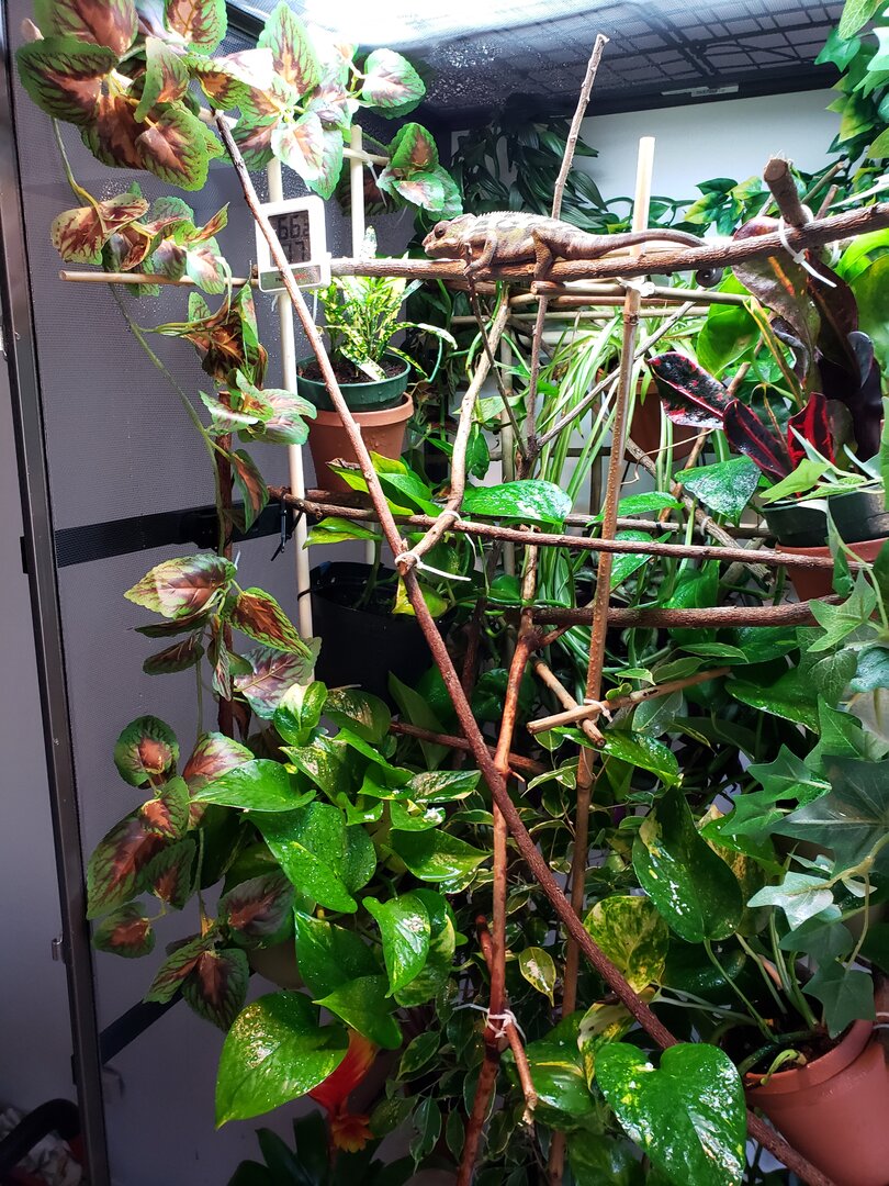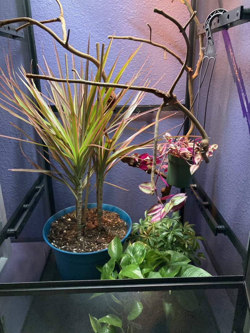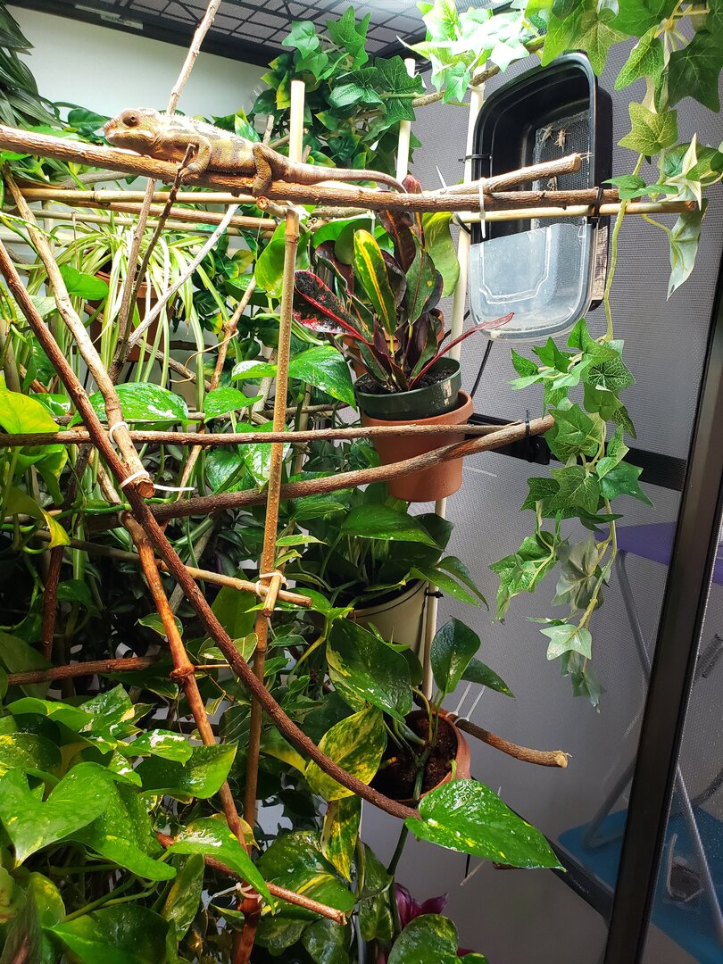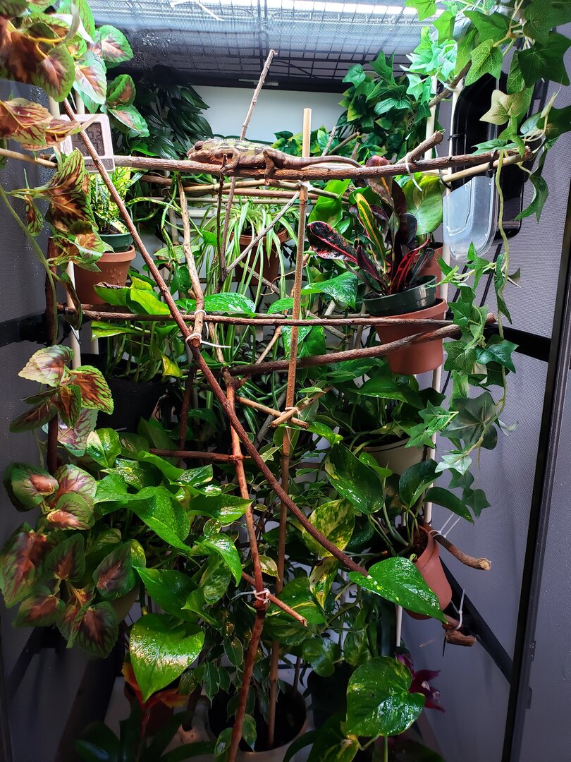 So sorry for all of that information, I figured the more the merrier! Now, I am concerned that the golden pothos and wandering jew will provide enough hiding places for the little dude, and I am concerned that the Scheflerra and Marginata will not be strong enough to support the chameleon or really even cover enough space as well... I would provide pictures but I am still really setting everything up, I am hoping to wrap a couple sides of the cage in a shower curtain to avoid getting water all over the walls, last thing I want is a chameleon to be living next to some mold I have yet to spot. Plants that are safe for chams are for some reason really hard to find around where I live (Near Seattle, WA).