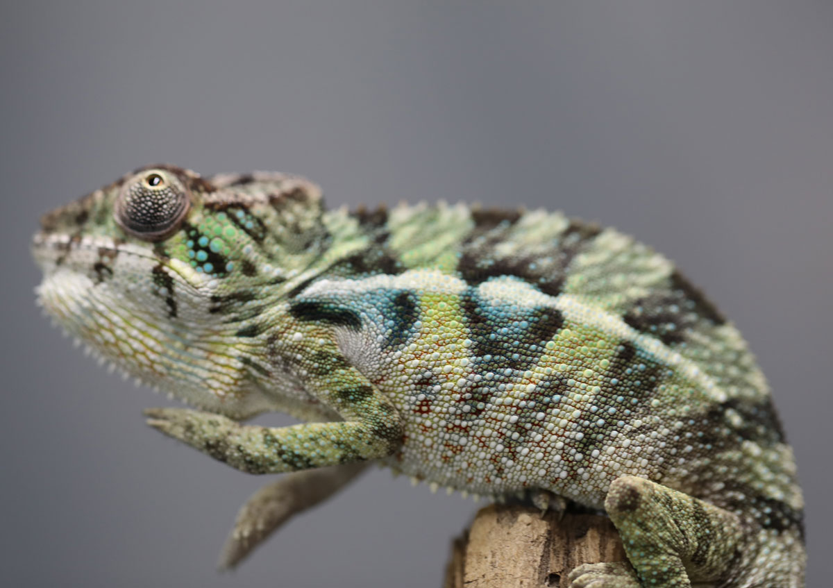 *SOLD* This handsome young lad is now ready for his new home. He should develop into a gorgeous yellow body blue bar Ambilobe. He is from our Kromatisk x Snapjacks Jr retained clutch. He is currently eating medium crickets, medium super worms, and the occasional silkworm. He is $485 plus $60 shipping. Send us an email to [email protected] or visit our website at https://www.chromaticchameleons.com/panther-chameleons-for-sale/