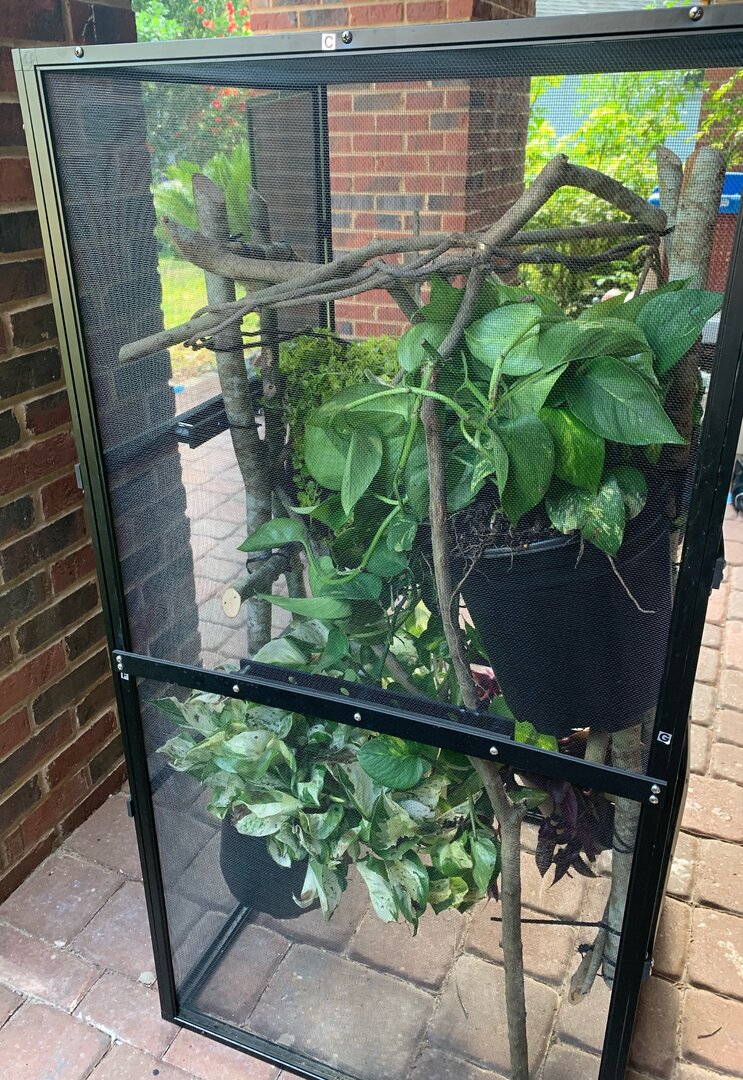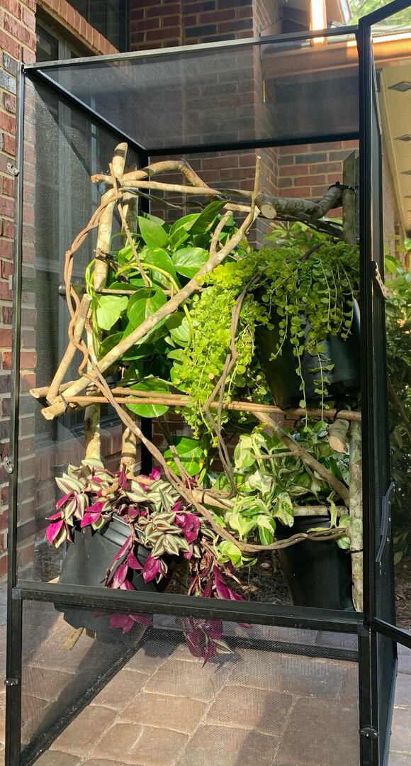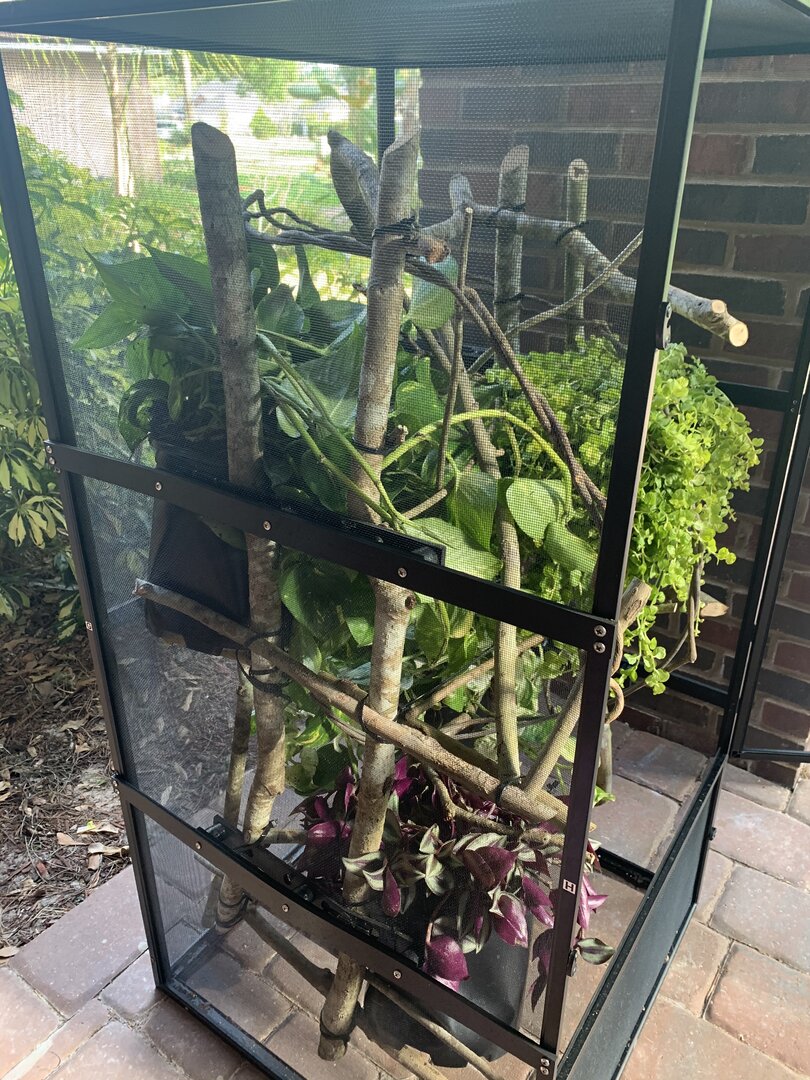 At this point, I’ve purchased a Reptibreeze XL 2ftx2ftx4ft cage with the hopes to build a larger enclosure at some point in the future. I’ve retrofitted the cage with Dragon Strand ledges and a drainage tray. My daughter and I spent today combing the woods behind our house and collecting branches to fill our cage. I’ve also purchased an Arcadia T5 UVB Kit with a 6% bulb. I’ll post a picture of my progress so far, but I think I need another horizontal branch higher in the cage for basking. In the coming days, I’ll also be purchasing plants at the local nursery to start filling the cage. Everything else is still up in the air. I still need the plants, a basking lamp and bulb, a misting system, supplements, and feeders. This is where your initial input would be much appreciated. I plan to keep my chameleon indoors and I live in Florida so temperature and humidity shouldn’t be too much of an issue.