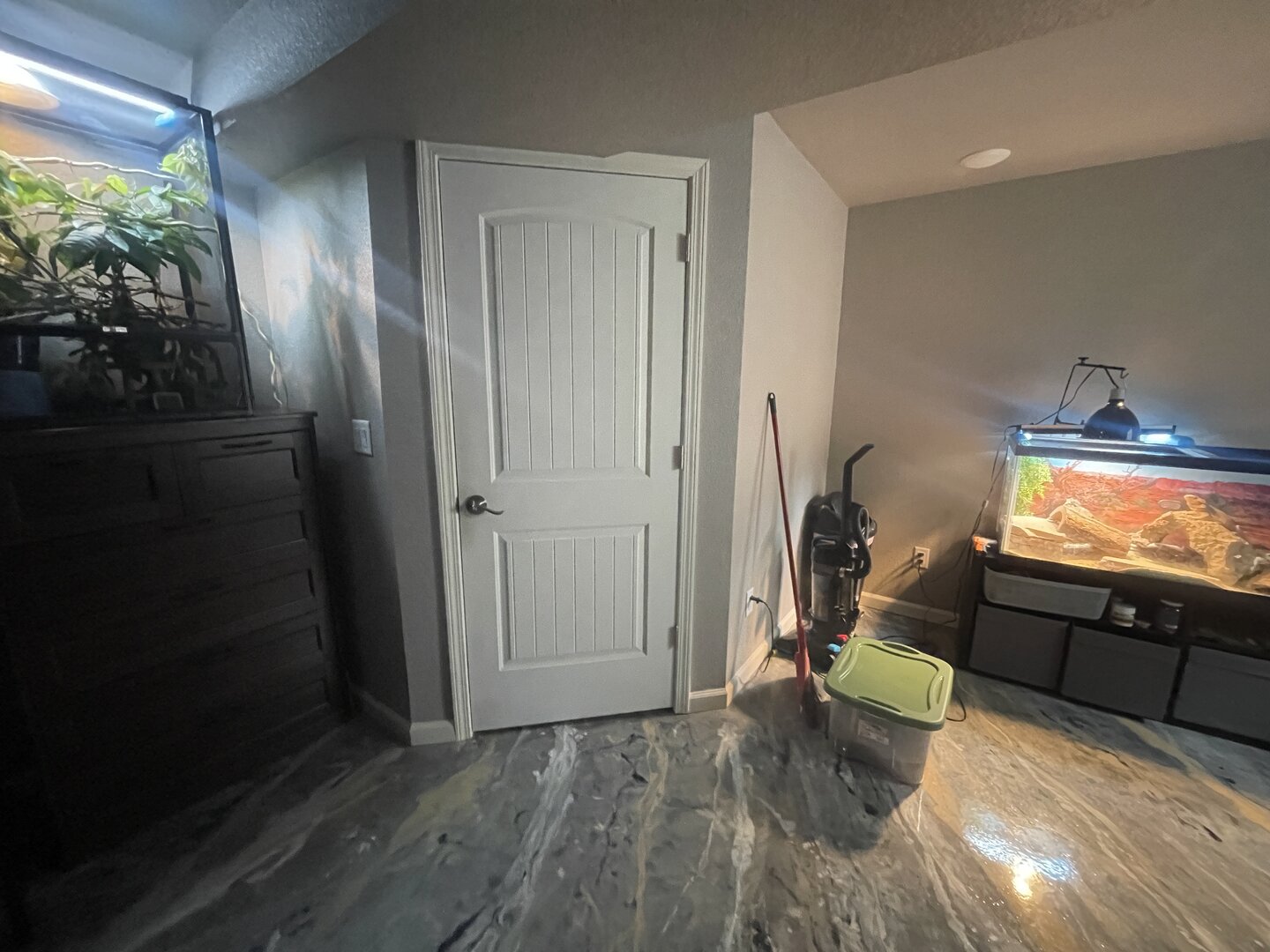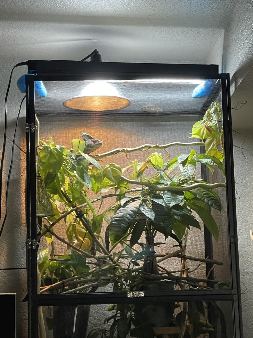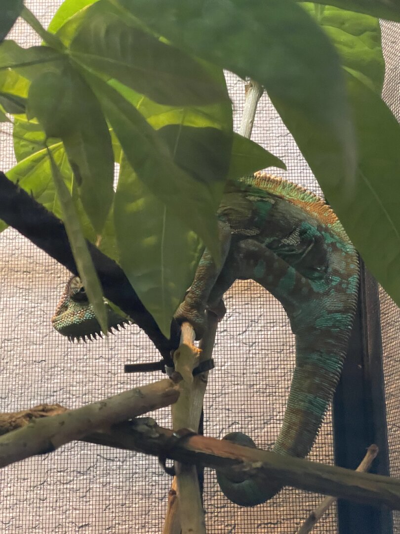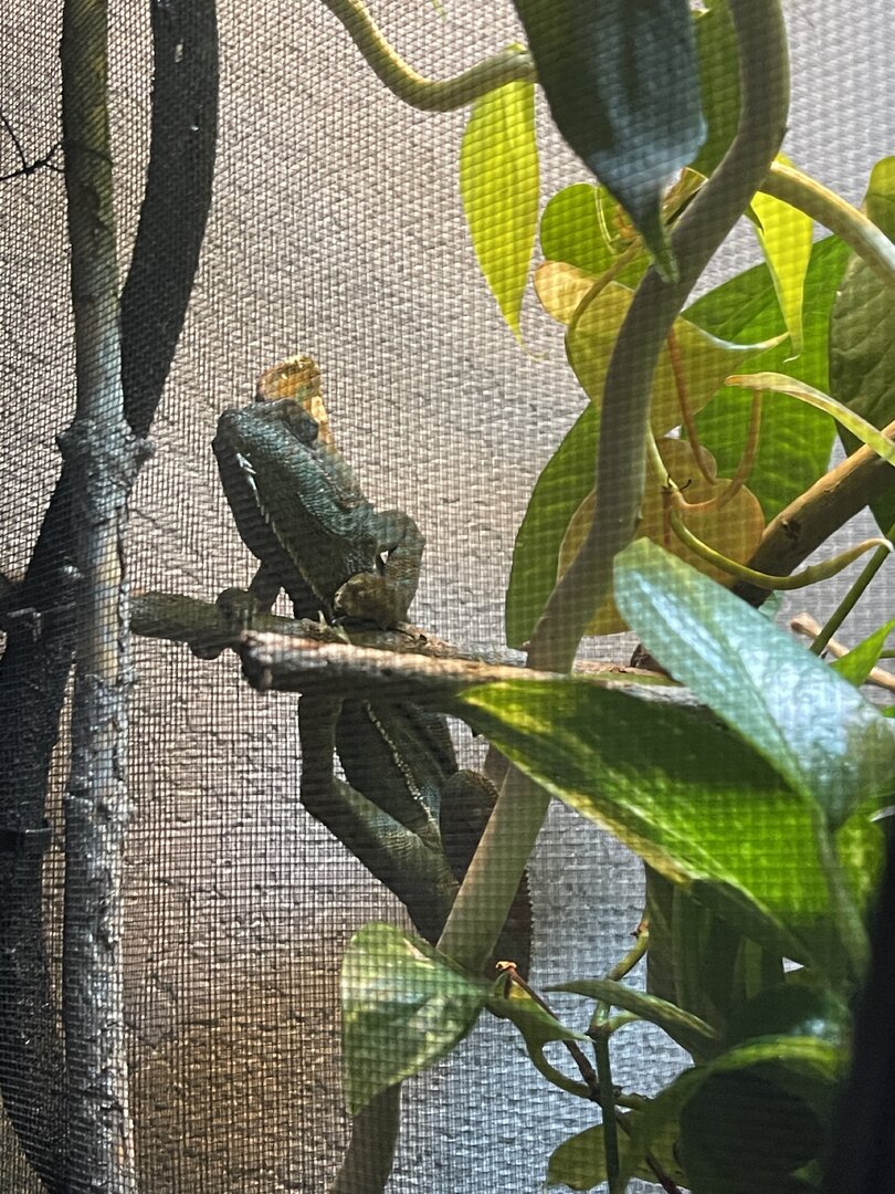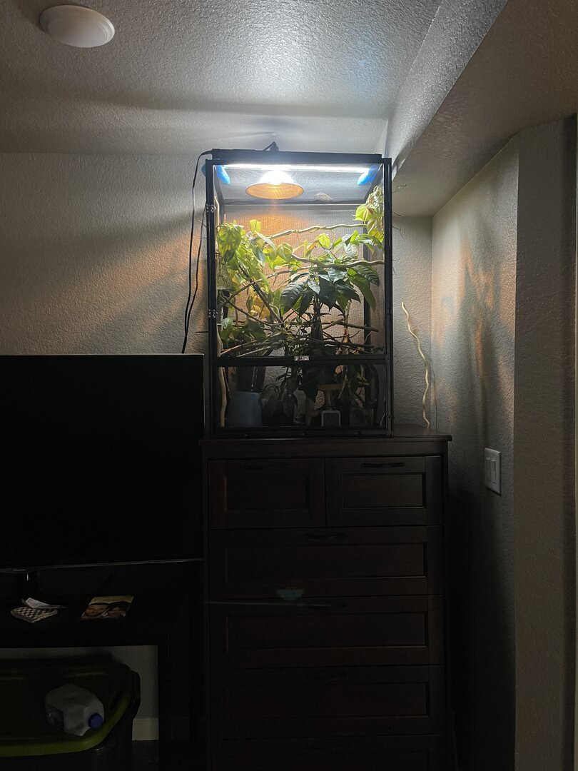 Hi everyone!! It’s been awhile since I have posted as I’ve been busy with work! But Spike is doing well! He went through a big change this week so he is a little shocked, as we moved his home out into our main bedroom (before he was in the walk-in closet) and I think that might have been why he was having trouble trusting us, beachside he only saw us when we went in there to spend time with him/ feed/ etc. well we rearranged the bedroom and got a table to put my bearded dragons enclosure on so we moved Spike out to a new spot , where he is able to see the whole room and hopefully someday he will want to come out and explore the plants we got for him. But right after we moved him he was definitely a little scared and was hanging out on a different branch towards the back of his enclosure instead of his normal top basking branch. Well he has begun to come to the top of his enclosure more and check it out. I’m very excited to see how he likes it. Also gassing in some new stick and plants for him in the next week or so!! Also