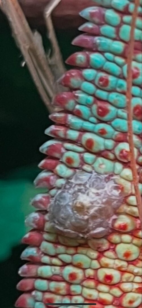 Hmmm, I have seen papilloma growths on panther’s in various places. This doesn’t really look like it to me. It looks like the scales are pushed up from the growth. Papilloma typically looks like a wart or kind of like a head of cauliflower. This would be best identified by a vet. If it’s an abscess it would need to be drained. If it’s possibly a papilloma or something else, it would need a biopsy.
