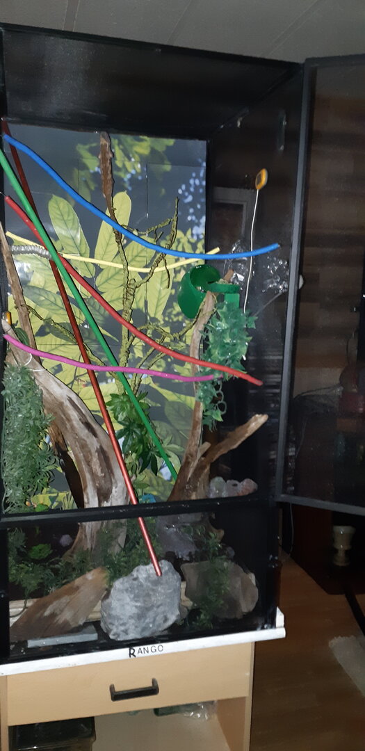 My veiled cham who is 4 months old seems to be happy in his 4 ft tall terrarium.Around 9am each morning when he wakes up I turn his lights on and he starts moving around. He then starts to explore his 32 sq ft enclosure that has approx. 25 feet of driftwood vines and wood peices to climb.He often comes to the front door when he sees me and when I open the door he wants to come on my arm.For the first 3 weeks he greeted me with open mouth and hisses. His natural enjoyment of coming out on someone's arm is the result of the girl taking care of him at the pet shop was taking him out at least 10 times per day since he was a baby.He seems quite happy since he has resumed doing this.He eats insects,salad and fruits.Here are 2 photos,one of my ccham and one of the terrarium.Please let me know if his color means satisfied or happy