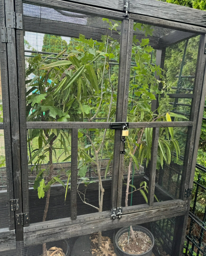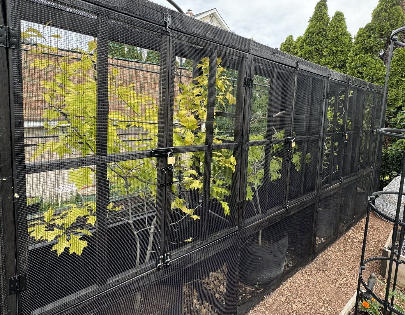 We built the runs out of 2x4s, with minimal cuts aside from the doors and horizontal reinforcements. We wrapped the enclosures in 4’ wide coated hardware cloth, trying to cover as much as possible in one piece for extra security. All 4 sides are covered with most seams overlapping. Every spring I need to tap in the staples or re-staple as they tend to back out slightly. Inside of the doors are overlapping pieces of wood to minimize cracks (where predators could enter) and to reinforce the doors). On top there is two layers of shade cloth, and 2 garden soaker hoses used to simulate rain (15 mins per day). The doors have bolt latches on inner corners to prevent predators from being able to press or pull at the doors. Thankfully, the only issue we’ve had are actually birds who (I am assuming) pinched and bruised Lola’s tail when let her tail’s tip wrap around the wire mesh and it looked like a worm. She’s fine and no longer pokes her tail out