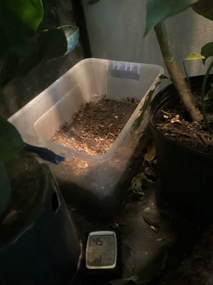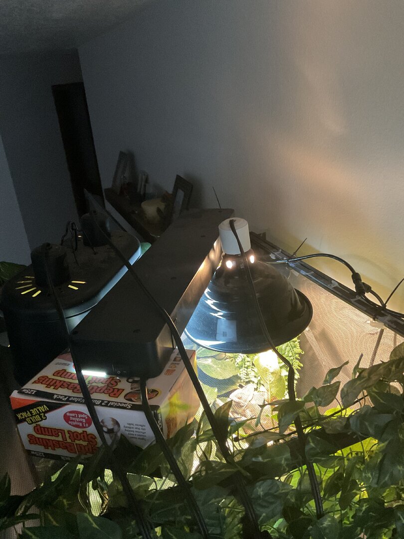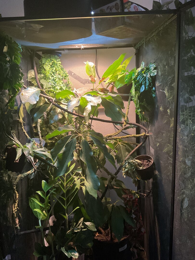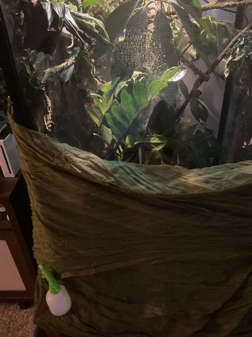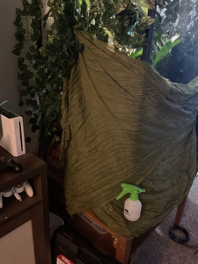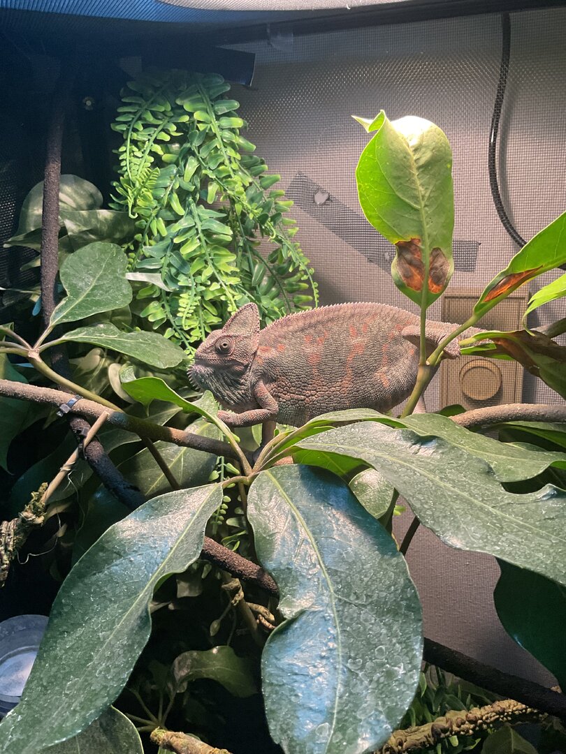 Hello! For the last week Margo (8 month old female veiled) has been completely restless, a darker color than usual (her color in the pictures is a little lighter than I’ve been seeing her), and her appetite has lowered. She’s normally a pretty light green. Her environment is suitable for her, she lives in a 24x24x48 enclosure, her temperature sits at 72 (She typically loves it at that temp) her humidity is around 50% during the day and 70-80% at night. She has a UVB light bar, a basking bulb, and a ceramic heat lamp (during winter months). Her enclosure has an abundance of live and fake plants so she has plenty of room to hide (I know some people don’t like the fake plants but they work for Margo as she is not a chewer). She also has a laying bin ready for her whenever at the bottom of her cage. I am giving her treat bugs as I’ve noticed she’s been upset this last week but she wont take anything. She behaved similarly before her last shed but this time she is completely restless (her weight does not indicate that she is ready to lay a clutch) she spends the whole day climbing up and down the walls and her branches. She is normally active during some parts of the day but this is significantly more than usual. What am I doing wrong? Pls help I just want Margo to be happy again! (She looks a little stunned in the photos because she is not a huge fan of me being up close to her, especially with a camera).