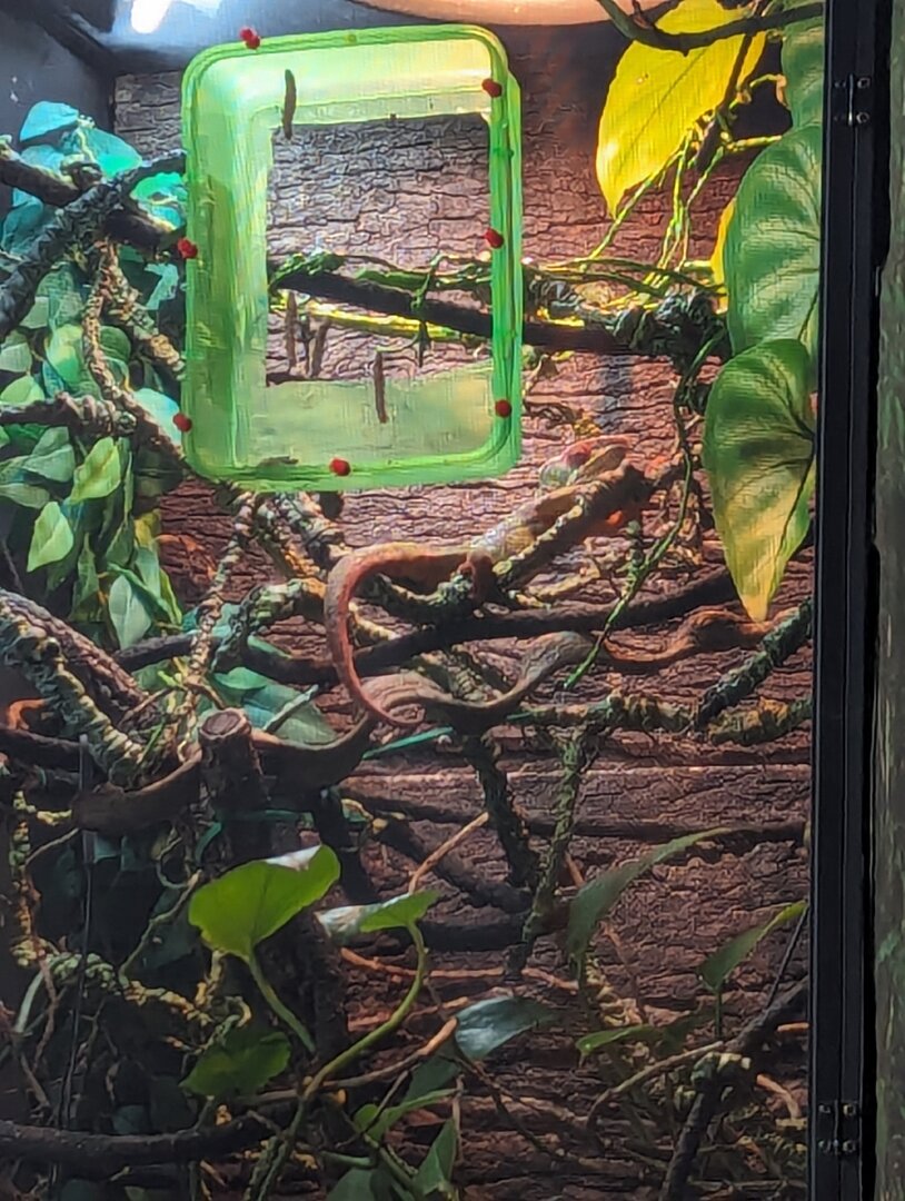 I've included a blurry zoomed-in photo from across the room. Unfortunately, his cage is a little sparse at the moment as his ivy isn't doing too well and I need to buy another to fill the gaps.
