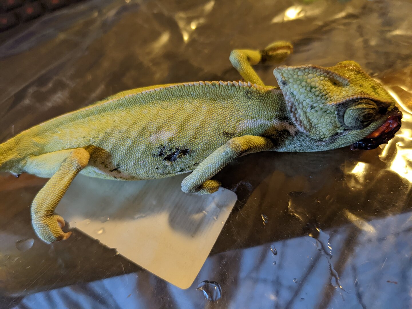 I‘m really, really sorry for your (sudden) lostI'm so sorry to hear of all these losses. I lost my first Chameleon l, Sylvanas on Wednesday. I am reeling from her death, questioning what I missed. I never saw her use her egg laying bin although she had gone to it a few times. Her belly seemed full at times but other times she made it look very flat. I had her for six months and bought her at 4 months (I believe), so she was just two months shy of a year. Prior to her death, her appetite decreased but she was still eating at least one insect a day, so I thought it was just part of her maturing. She remained as active as usual, no sunken eyes, white urates, everything looking normal. I came home to find her deceased, hanging by her tail from a branch with ants on her. Her tongue was out and bleeding. Her nose had dried blood and her eyes bled a little when I put her in a bag for preservation. I was a new reptile mom but I did a lot of research and did everything right to my knowledge. I don't understand what happened. I don't think she was gravid because I felt her stomach post mortem and didn't feel eggs. Please someone help me figure out what happened to my baby.