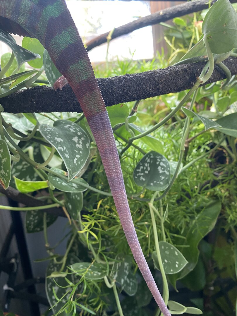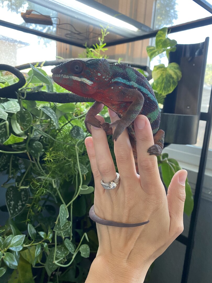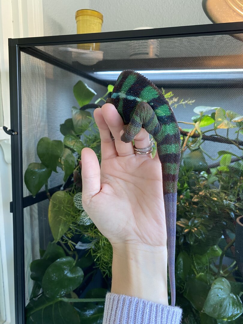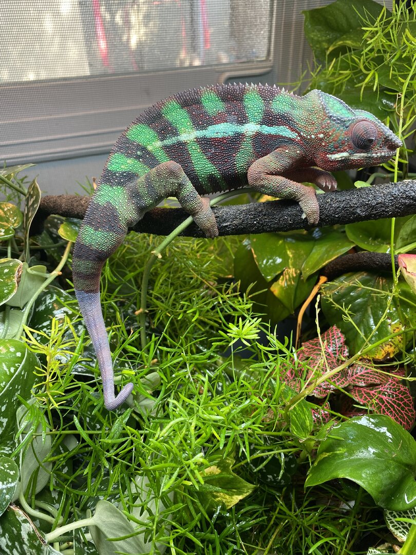- Your Chameleon - Loki is an ambilobe panther boy and I’m not sure of his age but we got him and his brother in December from a local breeder and they were tiny, only a a few inches long (we were told he was 3 months but I suspect he was a bit younger). They were our first chameleons so we didn’t know. So he’s at most 10 months old.