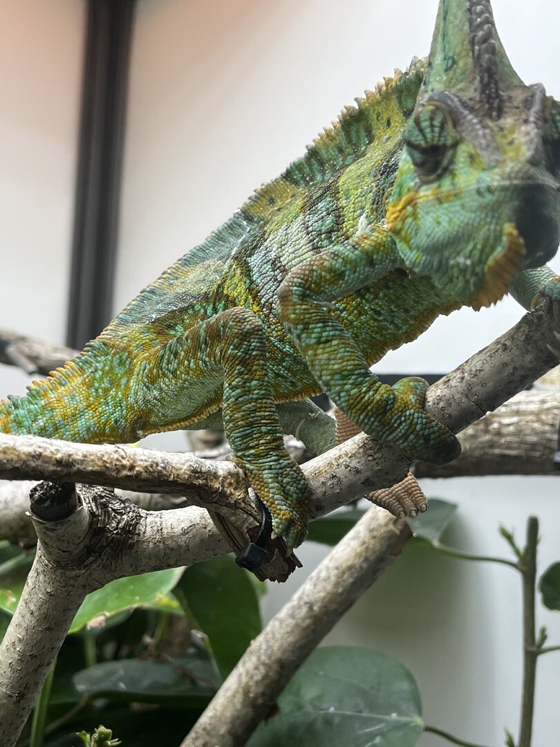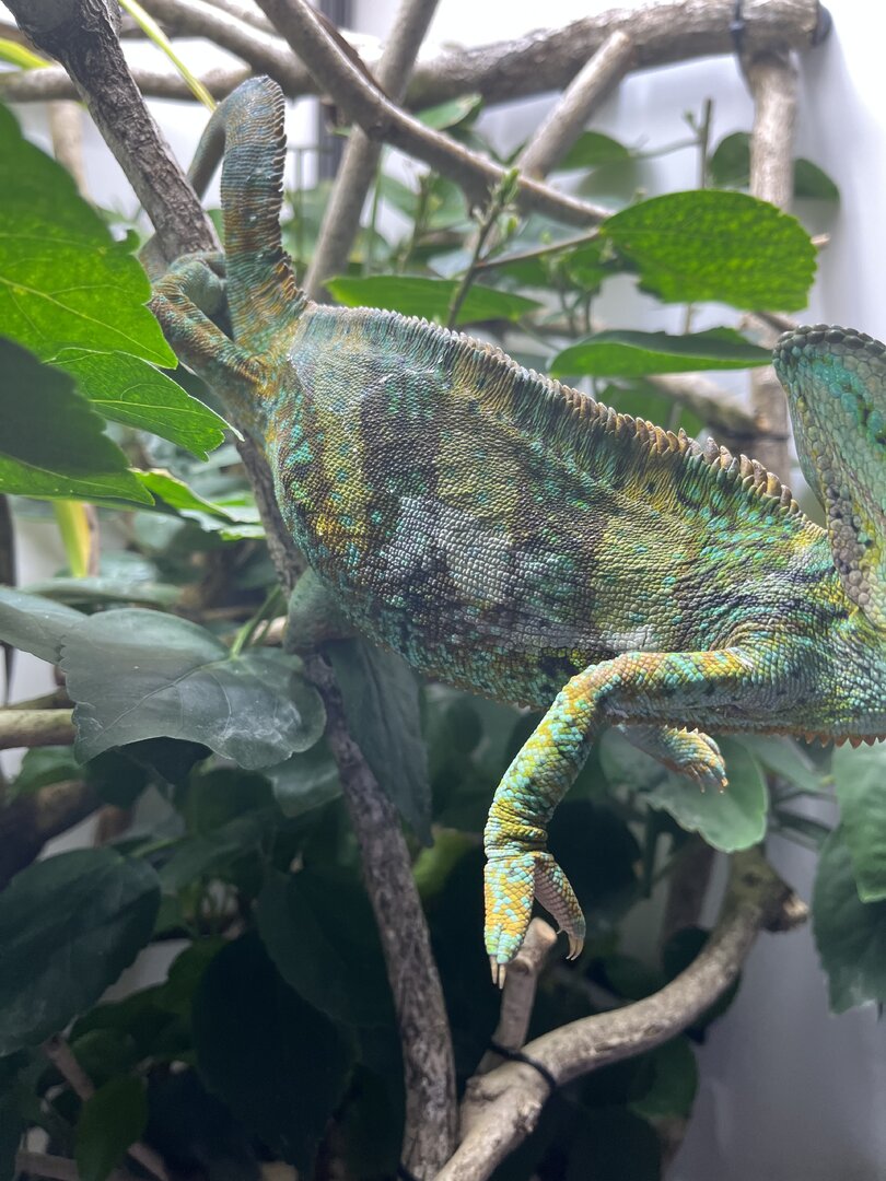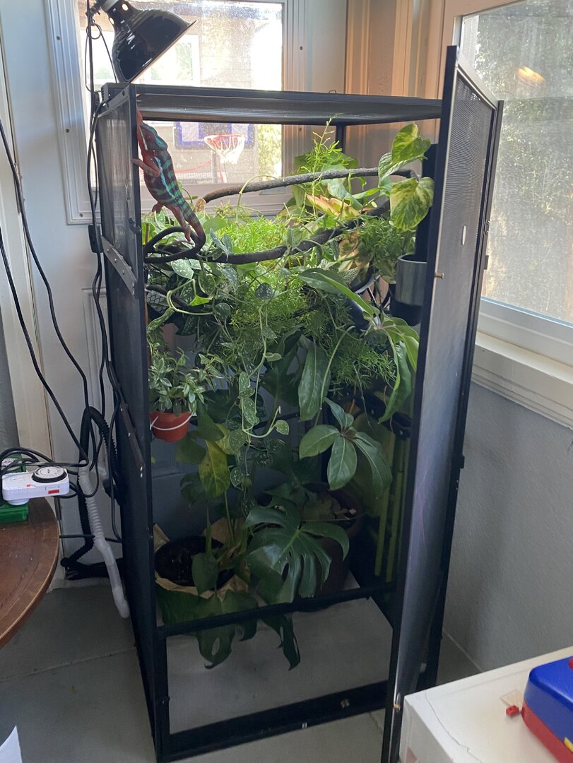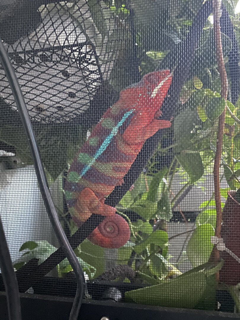 - He actively explores his enclosure spending the morning on his basking branch and then wanders the enclosure the afternoon and likes to spend time mid enclosure enjoying his foliage but rarely if ever at the bottom. He loves to try and escape anytime we open the enclosure- see the shenanigans in the pic of the enclosure I was trying to take. He also climbs on us if we ever have a body part close when his enclosure is open.