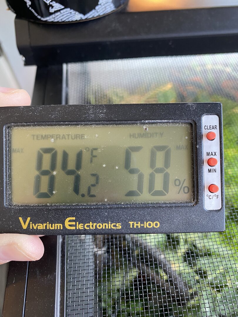 - Temperature - usually 70-90 gradient during the day, low of approx 65 at night this time of year, basking about 85-90. See pic I took of todays readings of ambient (mid cage) temp and humidity. I have a digital permanent hygrometer thermometer that alerts me to out of expected temps/humidity. It’s placed in the middle of the enclosure. I also use portable therm/hygrometer to check basking temps.