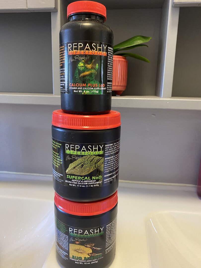 - Feeding - they’re Fed adult black crickets every other day (put in 5-12 depending on size into feeders and they eat a portion and leave some which I remove) and a few superworms once a week or two as a treat, they’re gut loaded with repashy bug burger and mainly sweet potato yam/carrots and dusted every feeding with repashy cal and every two weeks with repashy cal loD - see pics