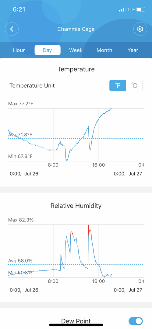 - Humidity - usually 50-85, average usually 50-60. We live in a dry area so its hard to get it above 60 during the day in between misting. Our night fogger broke and a new one is on the way. So I spray the cage down before bed and if I wake during the night (more often than you think with a toddler). It has been dropping at night though. We usually fog for 5 hours nightly but our fogger was just dumping all its water and I tossed it about a week ago.