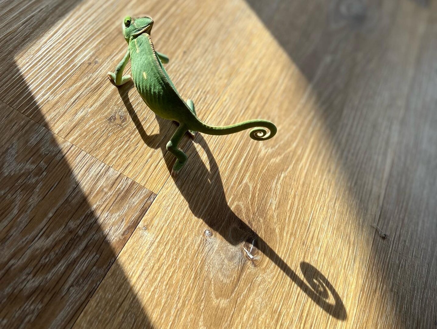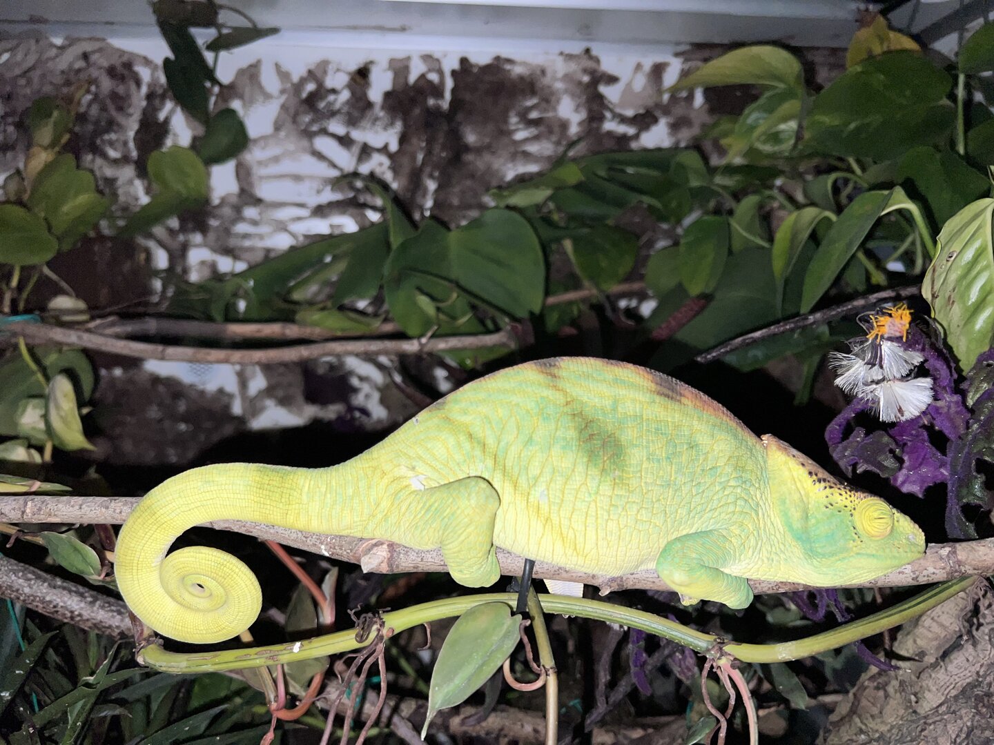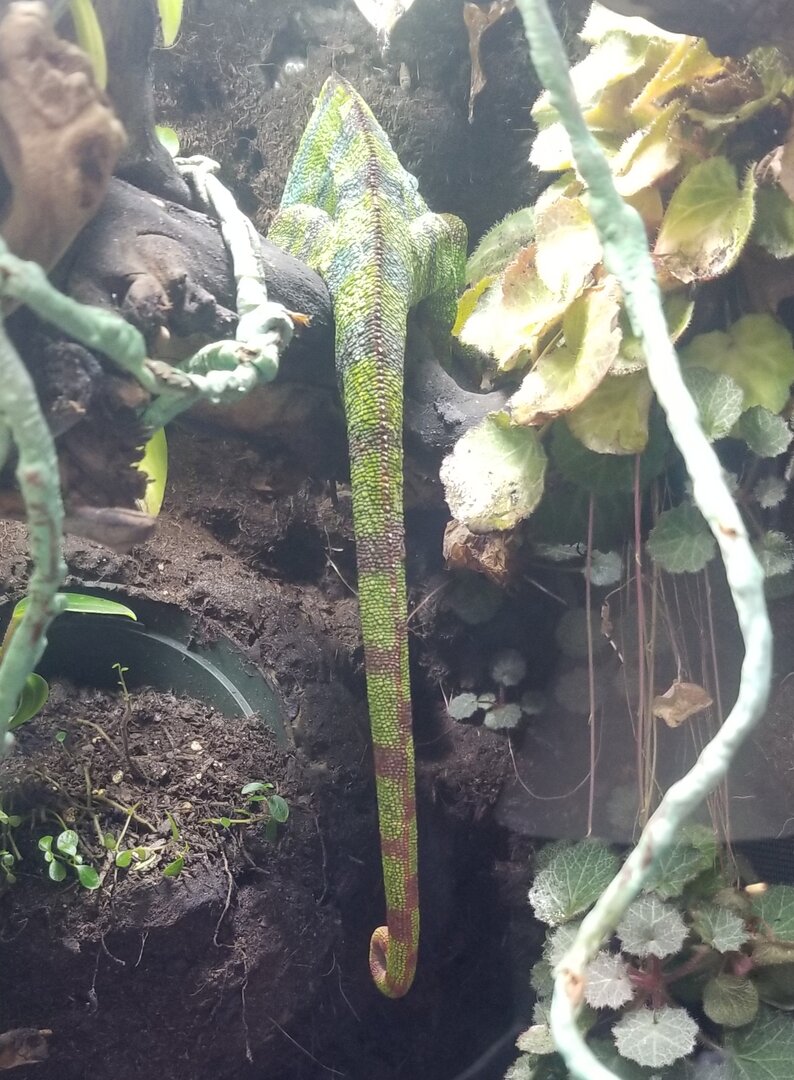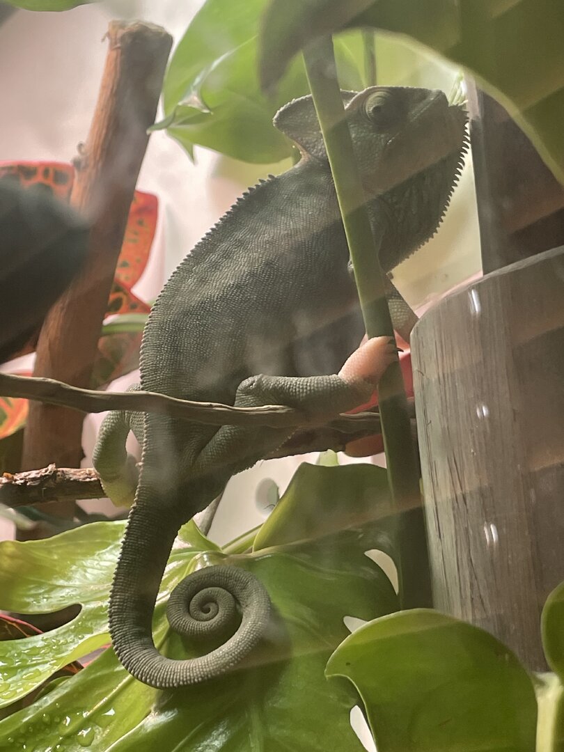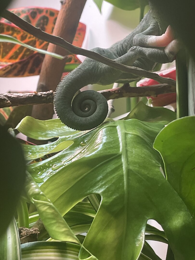 Happy Tuesday hope everyone and their chameleons are having a great morning 🌞 it's a little gloomy here but some tunes will get us through Cleaning the enclosure. While I do some maintenance its time for the little guy to play in the houseplants. Spotted this mini curl while he is was exploring the pothos.
