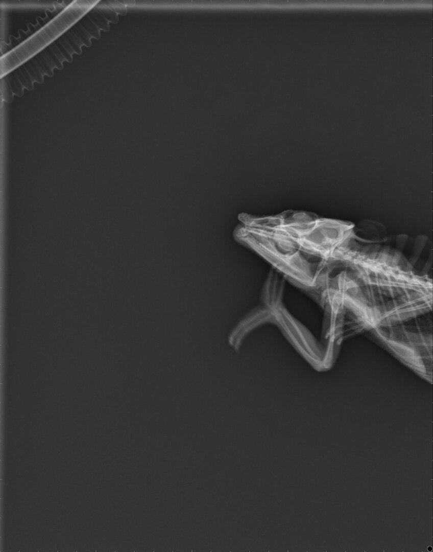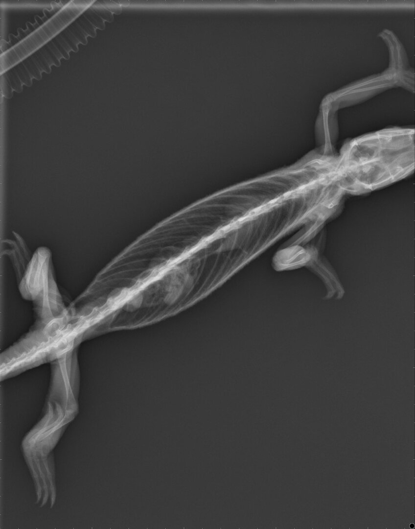 First we took rads to see if there were any lesions in the bone where the teeth sit. The first one is the teeth which look normal. We also got a full body which is interesting..she said unless there are females with eggs on board they are "empty". All you can see on Pellinore is some food product in the stomach, the kidneys are back in the hip girdle between those bones. Not seeing liver or kidneys is good as they only become enlarged when they are problematic.