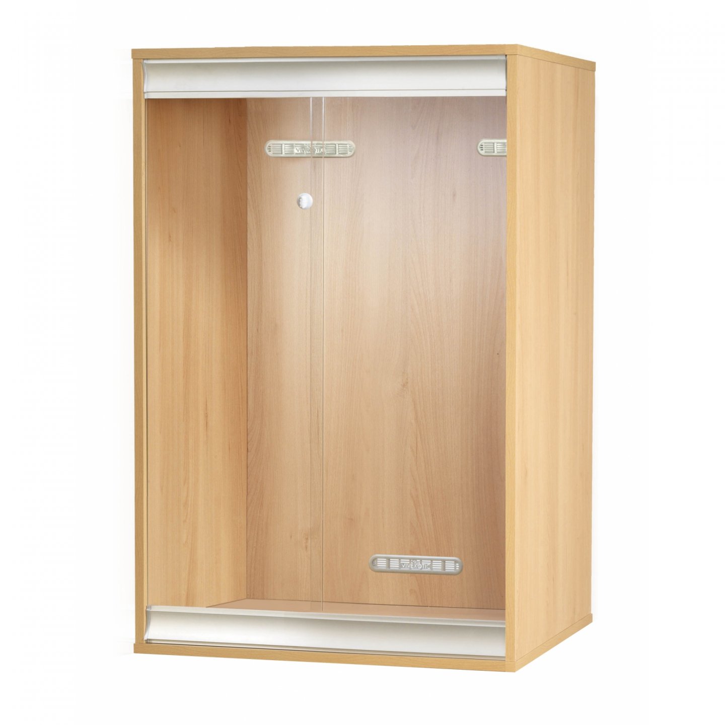 After doing LOTS of research, I decided that an all glass enclosure was a big no-no, but as I live in England in a very old and draughty old granary built sometime in the 1500's, all mesh wasn't going to work either. Struggling to find something that would work well, I decided to adapt this existing viv. I have cut out two panels on the sides at the bottom. I am hoping that this, combined with the air vents at the top and mesh cutout in the roof, will provide some good air flow. If not, the plan is to get rid of the glass doors and replace with mesh ones.