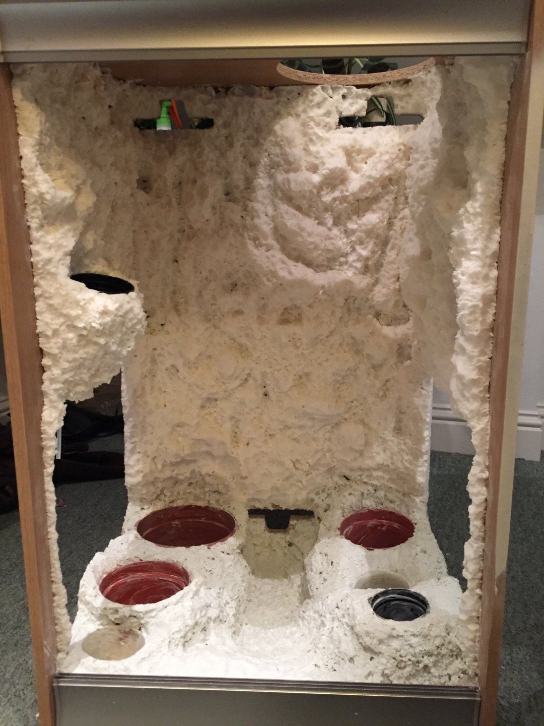 So far I have used expanding foam to sculpt around the walls for a more naturalistic feel, and started to cover with grout. I encorporated the plant pots for the ease of switching and changing plants. When the grouting is finished I will be painting the lot, sealing with an aquarium safe sealant, and stuffing full of plants and vines and branches for lots of hidey places. Struggling to find a sealer I will be sure is safe atm, but I have a few weeks until I'm ready for that so hopefully my research will be fruitful! (Suggestions welcome! ;))