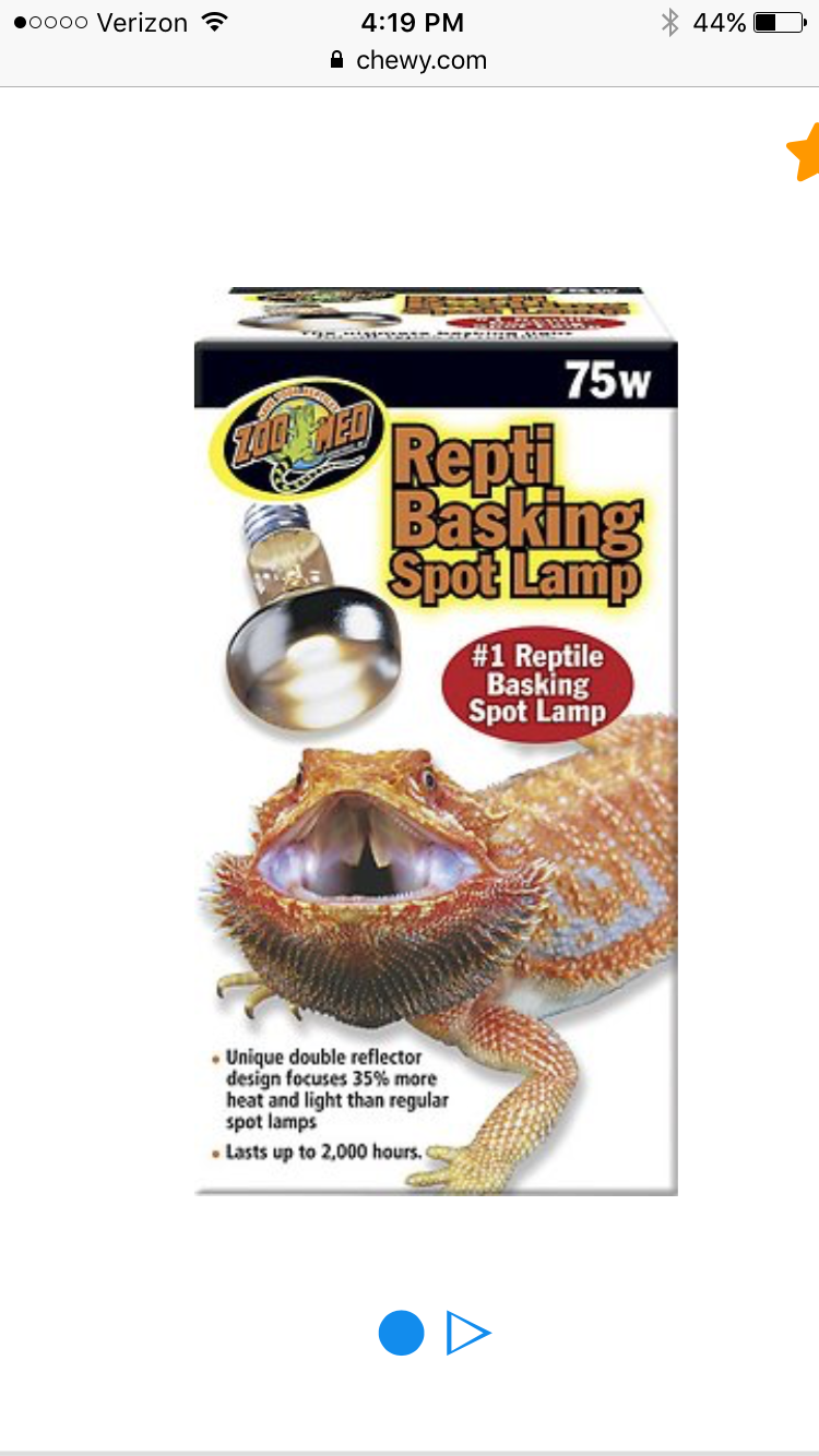 Just wondering what I need to do to get my temps up. Almost every source says to go with a 60-75 watt heat/basking bulb, and I have a 75 watt one. They say anything above 75 can burn them. Most chameleon owners get desired temps from this, but not me. With the 75watt bulb, I can get the basking spot to 75-80, and everywhere else in the cage is room temp (65-72). So if I want the desired temps of 85-90 for basking, can I go any higher? The reptile guy at the pet store says I could use higher watts and he reccommended 150 watts, as it says on the box for the 150 watt bulb that it goes to 92 in the basking spot, and mid 80's everywhere else. His main basking branch is about 6 inches away from the top of the cage. I just don't want to burn him with higher wattages. However if I want the proper basking temps, do Ineed to get a higher wattage like 150??Here is the basking bulb I currently have: