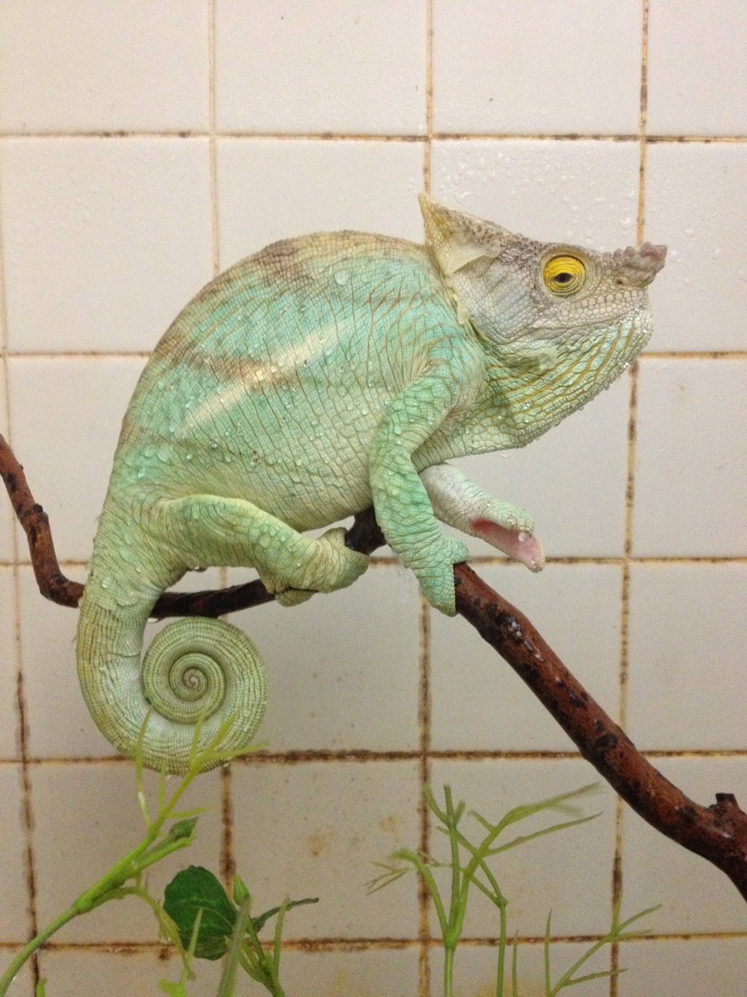 A- Not as much as some people think. These giants are not the most active chameleons I've ever kept. That said, I'm not saying they will be fine in a tiny 24"X24"x48" cage like many keep their Panthers. I keep Atlas in a custom cage I made out of a converted closet. His home is 8' long X 7' tall x 30" wide. However he only uses about two thirds of that. Parsons tend to find a spot they are comfortable in- and they sit there. Very very boring animal to watch. A Parson roaming all over the place is either an animal looking for a mate, or an animal very uncomfortable for some reason. Now I've seen people go nuts and built magnificent full room habitats for their legendary Parsons, but it's overboard. In some cases the habitats built are going to be problematic over time for the keeper to maintain.... think mold, cleaning, finding the animal, dead feeders, air circulation, fire hazards, and more. I'm not saying don't give your Parson a nice home, but for the beginner reading this for their first Parson- don't buy into the hype that you have to kick out your first born and convert their room for a Parson.