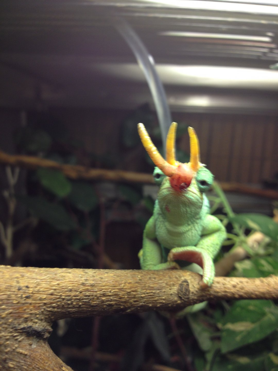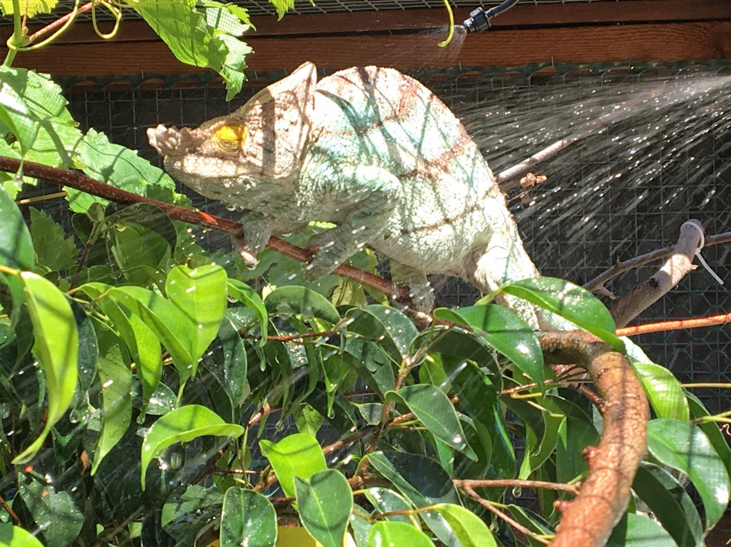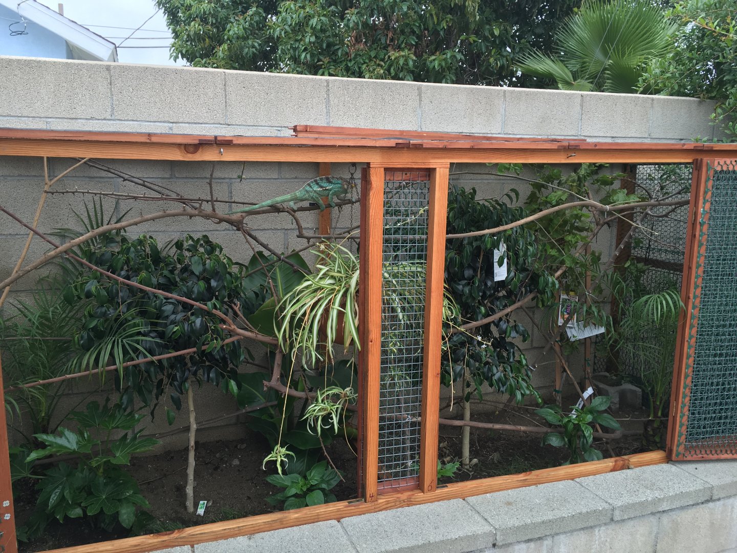 That was when it was new, now the plants have filled out and it is very very dense, just the way he likes it. Before he didn't use much of the space but now he roams it always sticking with the foliage. He has misters and a single sprinkler inside he uses on warm or even hot (90F) days.