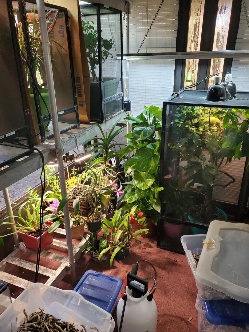 The concept is to make it as close to a forested area as possible. Climate control is pretty easy to maintain - all the windows open up and there is a 3 tier sliding door that leads to the house. I wish the ceiling was about 6 inches taller so I could suspend my lights better, but otherwise i like it. I used to have a smaller sized office with just one large window for my boys and girls and bugs... now i can organize it a little better, hang plants and lights, keep the bugs together and have my plant nursery in one room!