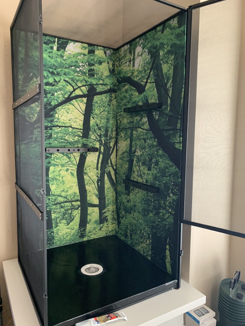 We bought coroplastic boards on Amazon that fit our habitat, had to cut them down a tiny bit to make them fit inside though. Just used a spray adhesive to attach a rainforest shower curtain. Here’s a couple of pictures of before we filled in our habitat and after. Make sure you seal with silicone where the 2 sides meet and at the bottom. If you decide to go this route. Just another option for you regarding backgrounds/walls, if you don’t have a dragon habitat.What is your back wall made of? Foam? I am in need of something similar for mine.